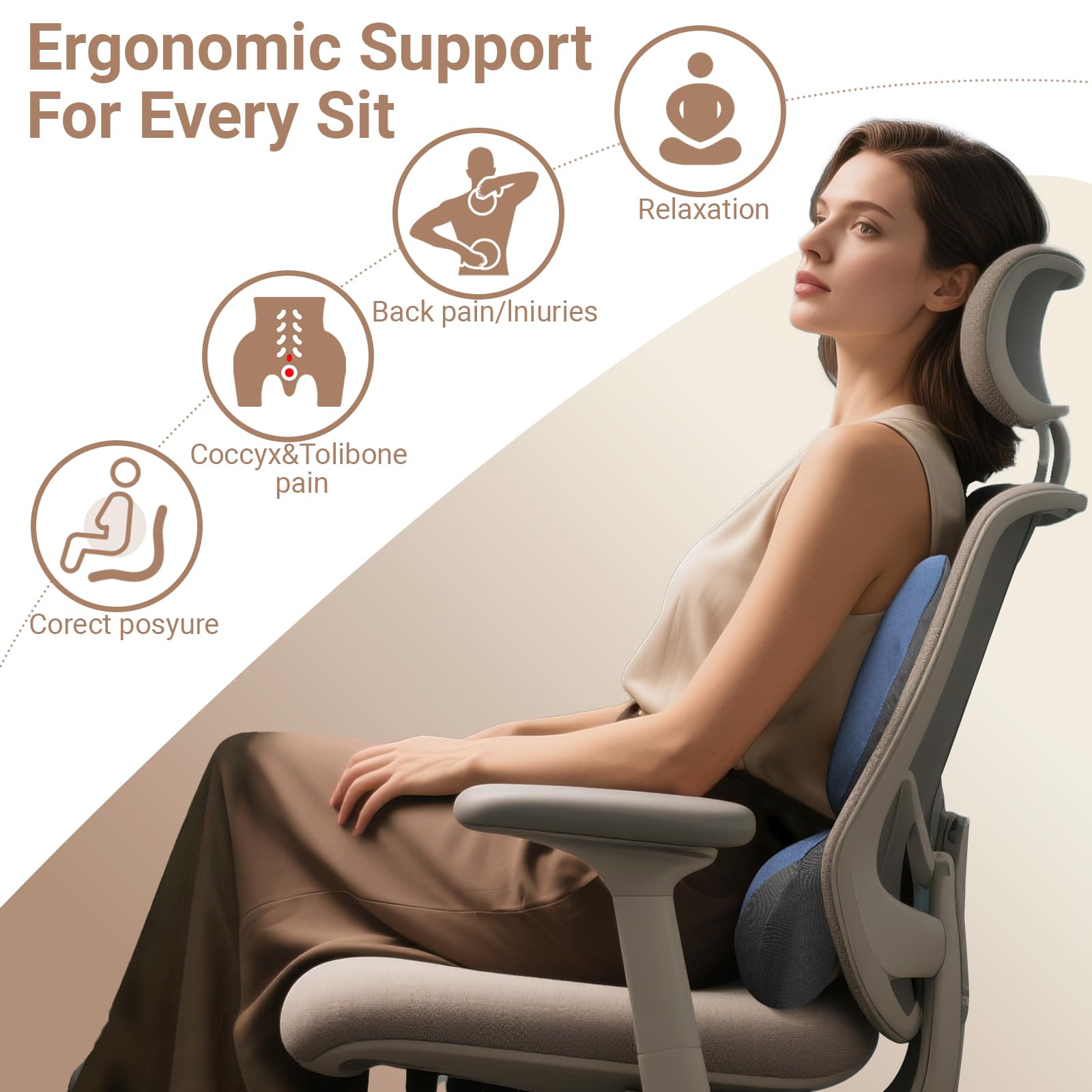 • Ergonomic Design: This Chair Back Support features advanced ergonomic design, perfectly contoured to the natural curves of your spine, providing more support than a standard cushion. It effectively supports the upper back, mid-back, and lower back, significantly alleviating back pain and fatigue from prolonged sitting
