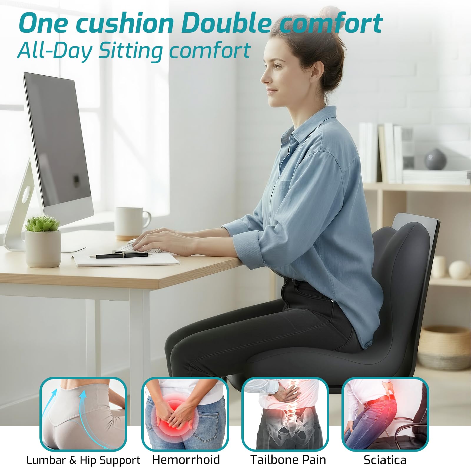 • One Cushion, Double Comfort: Our uniquely molded one-piece design combines lumbar support and seat cushion comfort, offering comprehensive support that alleviates discomfort from prolonged sitting. Say goodbye to hip and lower back pain, including sciatica, and enjoy all-day comfort