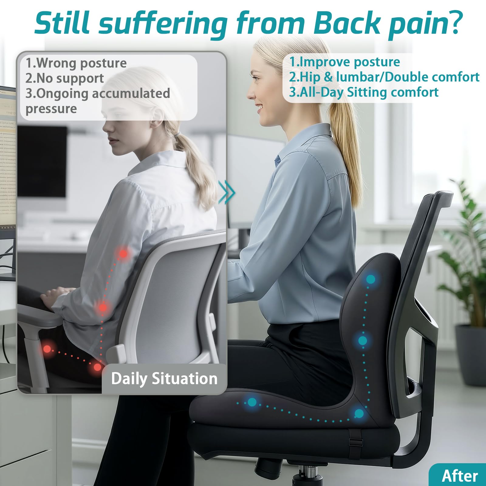• One Cushion, Double Comfort: Our uniquely molded one-piece design combines lumbar support and seat cushion comfort, offering comprehensive support that alleviates discomfort from prolonged sitting. Say goodbye to hip and lower back pain, including sciatica, and enjoy all-day comfort