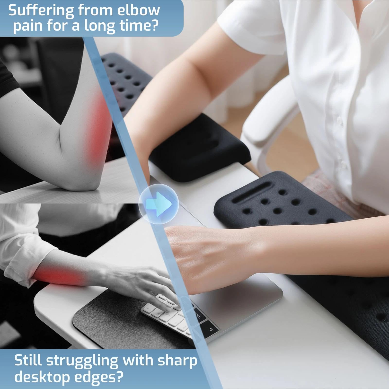 • Dual-Pad Comfort: Featuring two adjustable memory foam elbow pads (11.81” x 3.94” each), you can easily customize the spacing to fit any desk setup. Whether you prefer a straight or L-shaped configuration, this product adapts effortlessly to your workspace,ensuring optimal comfort and support