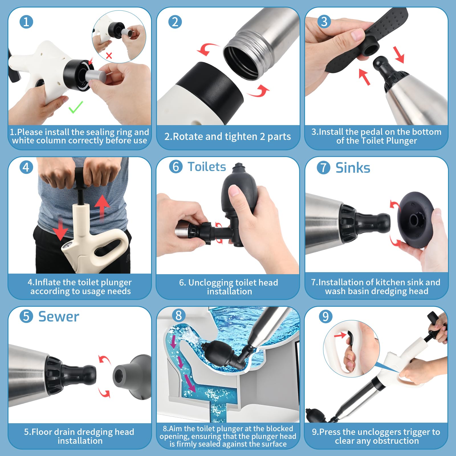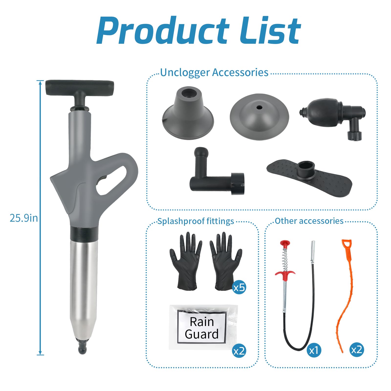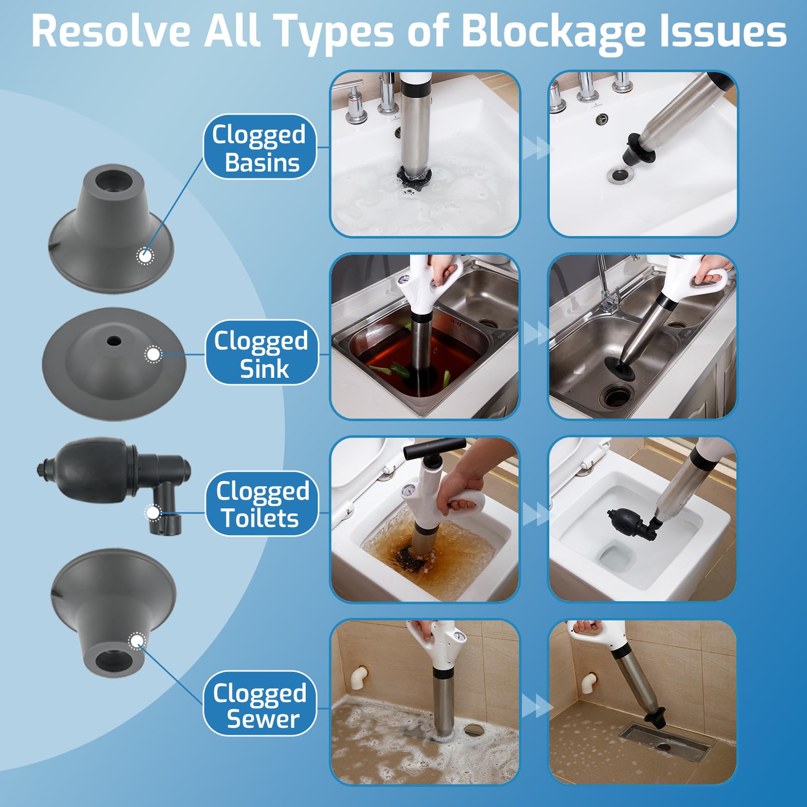 - Efficient Unclogging Harness the power of advanced air compression to blast away stubborn clogs in seconds. From hair and grease to food scraps and small objects, this high-pressure tool clears blockages effortlessly—outperforming traditional plungers