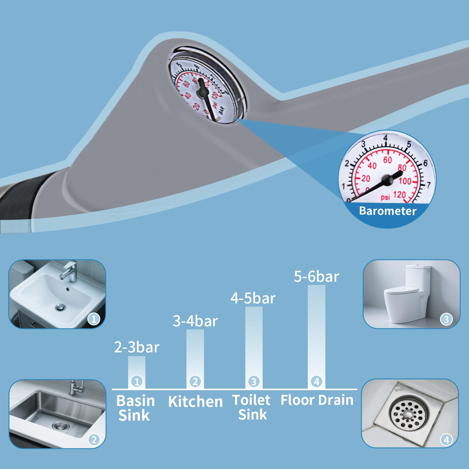 - Real-Time Pressure Control Stay in control with an easy-to-read pressure gauge that lets you adjust for any clogging condition. Prevent splashes and ensure safe, effective use by following recommended pressure levels: 1-3 Bar for sinks, 3-4 Bar for kitchens, 4-5 Bar for toilets, and 5-6 Bar for floor