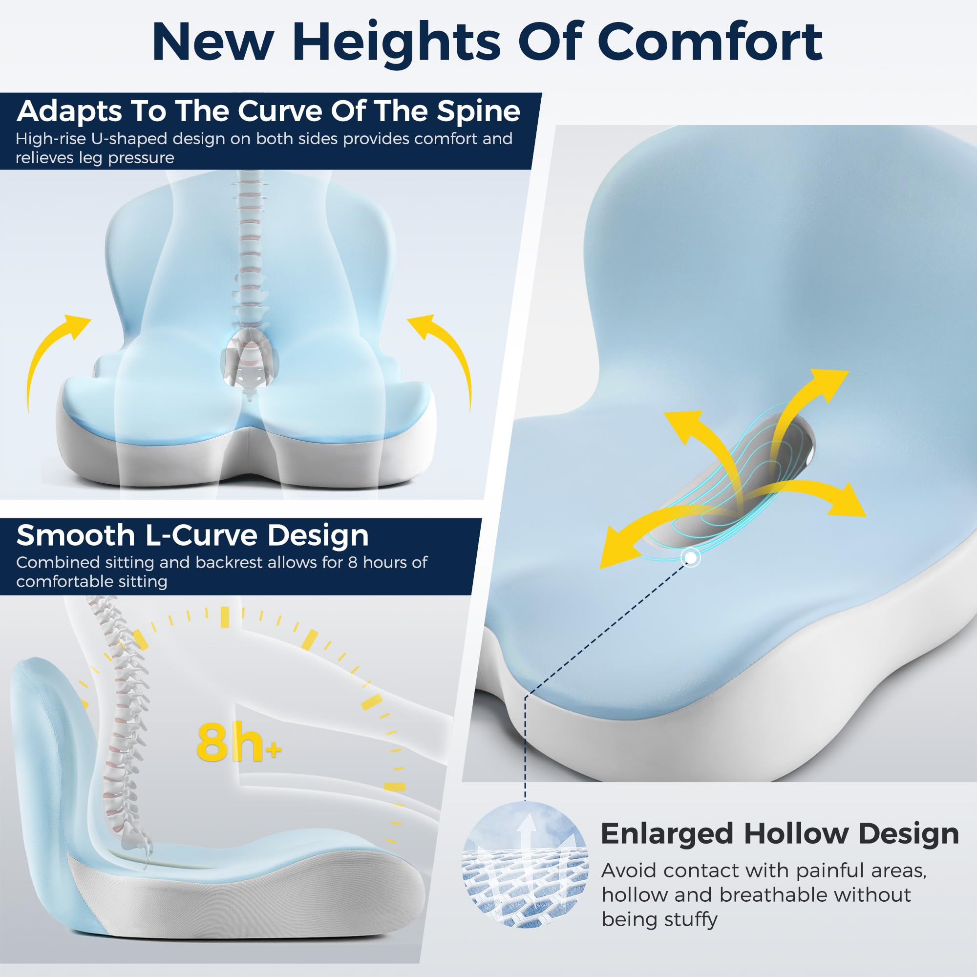 • 【Ergonomic One-Piece Design】:This L-shaped seat cushion is an integrated chair cushion that perfectly fits the natural curve of your spine, providing firm lumbar and hip support. Our office chair cushion helps relieve tailbone, encourages a healthy S-shaped posture, and reduces discomfort from long sitting sessions.