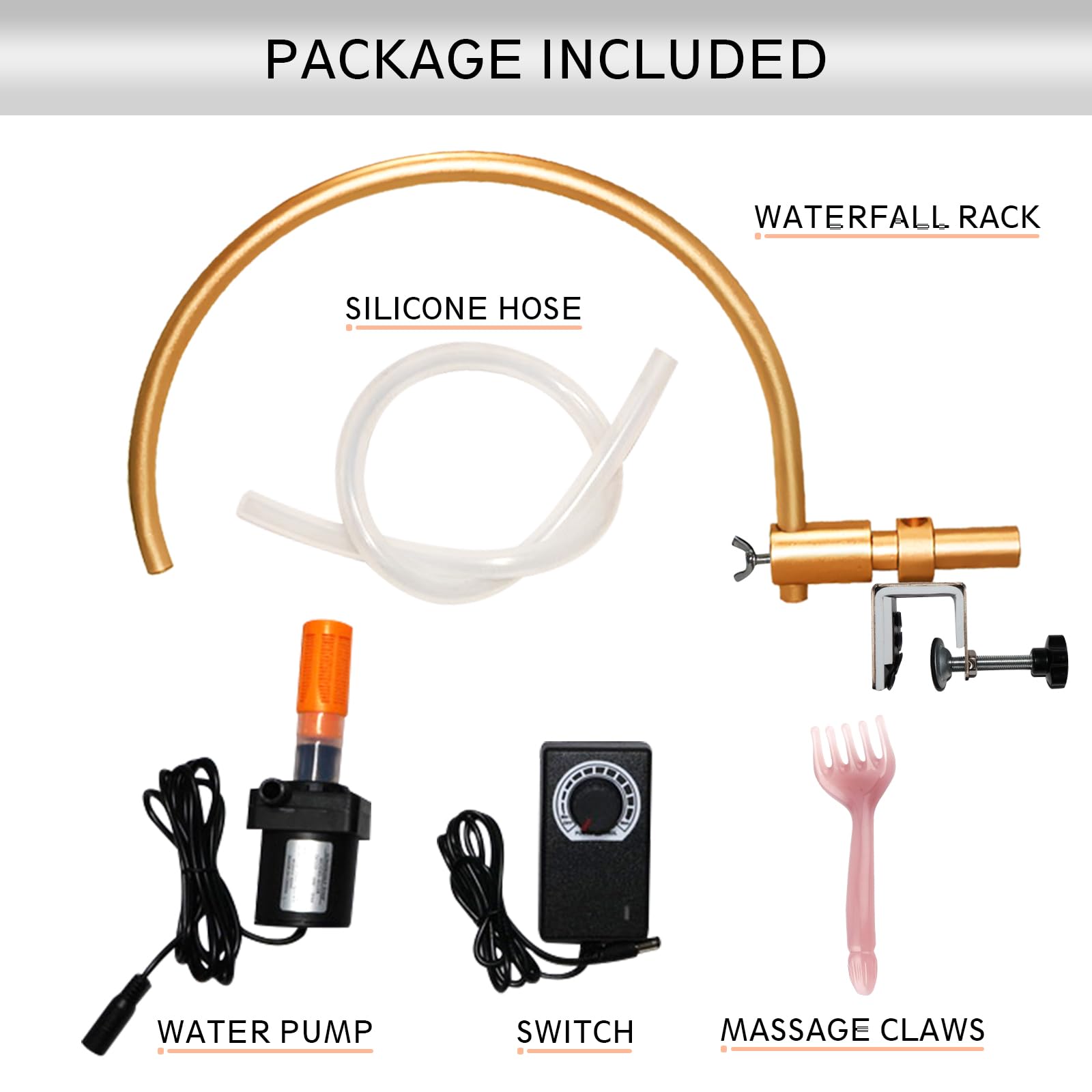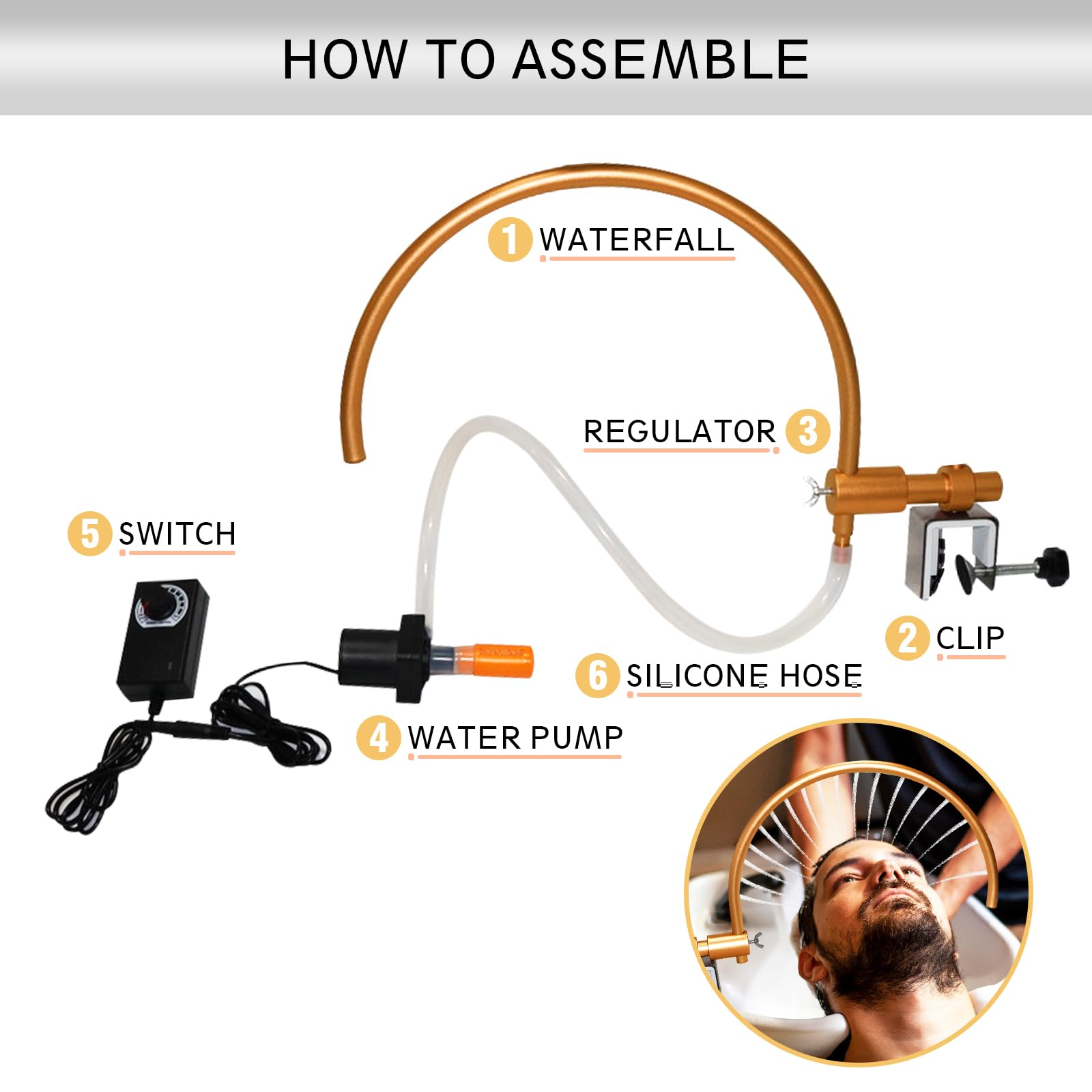 - How to Use: Use the C-clip to clamp the water outlet frame to the edge of the basin, and the sink clamp comes with a wing nut fixed design which make the frame easier to be removed or adjusted. Then put the water pump into the shampoo bowl. Finally add water to the bowl, and the water level exceeds the pump body. Plug in and twist the water pressure regulator,then you can easily achieve the water circulation in your shampoo sink.