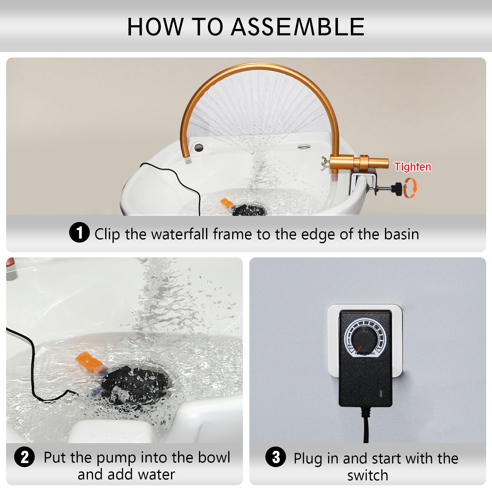 - Easy to install.Clip the waterfall frame onto the edge of the shampoo bowl and adjust the tension, put the pump into the bowl and fill water to cover the pump,then you’re good to go.