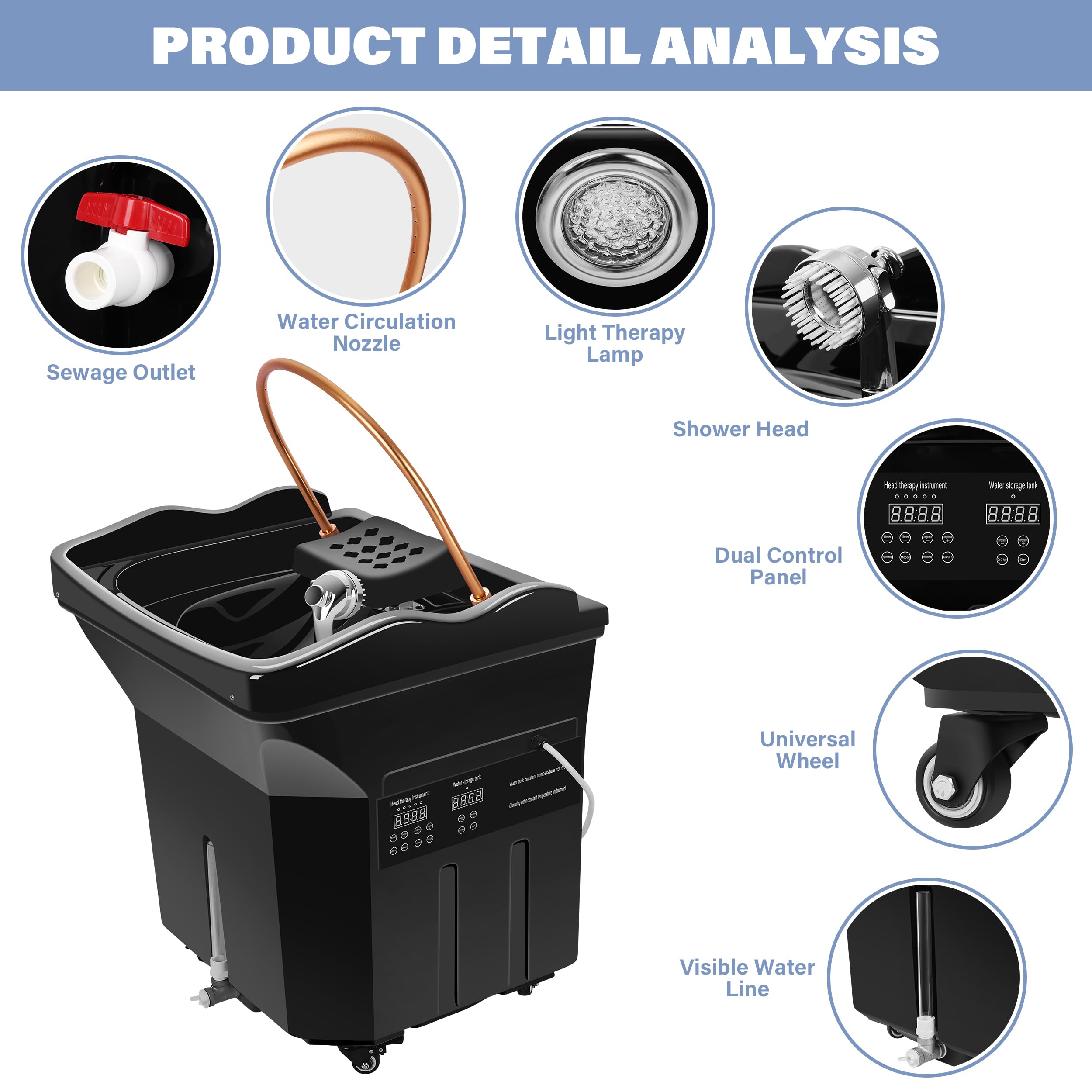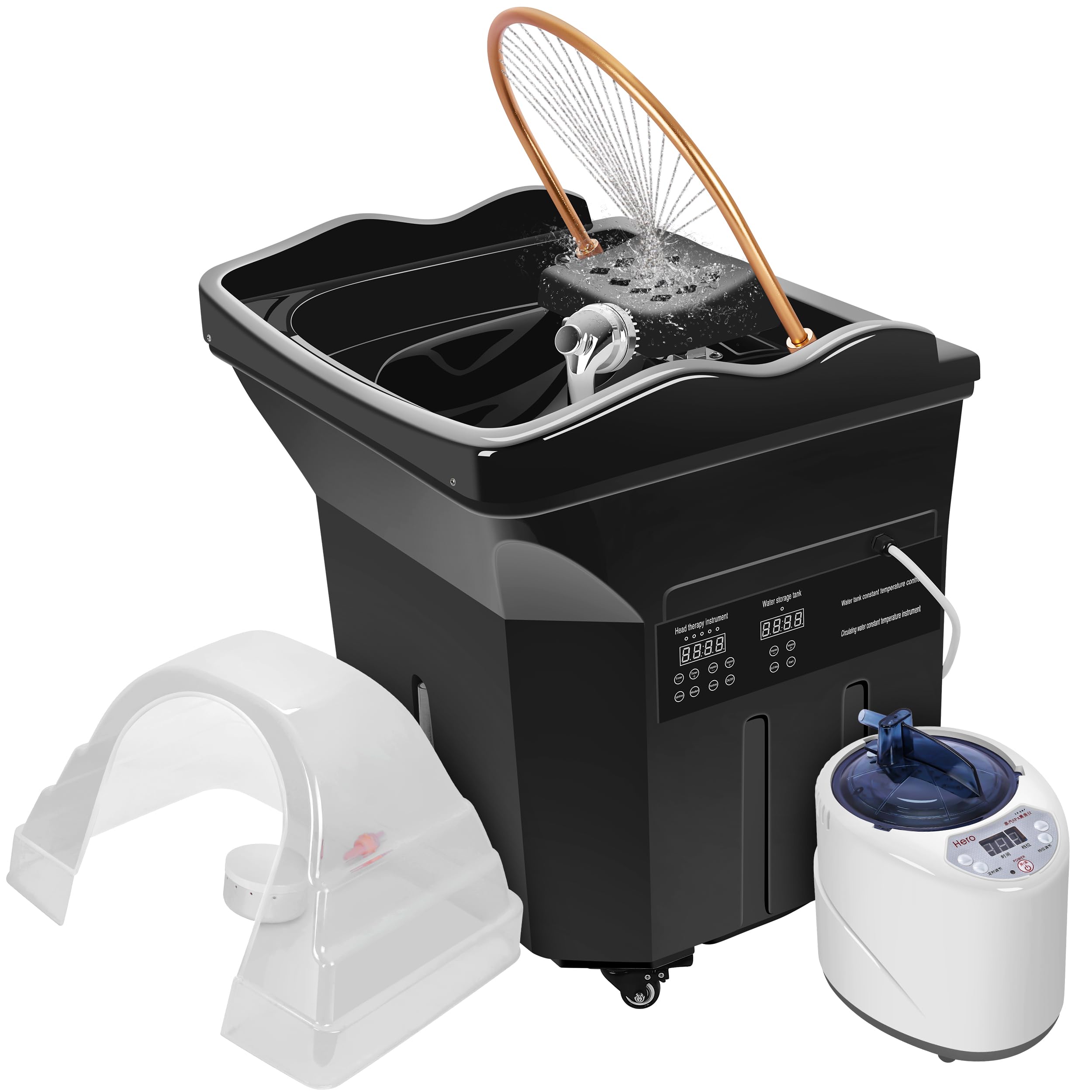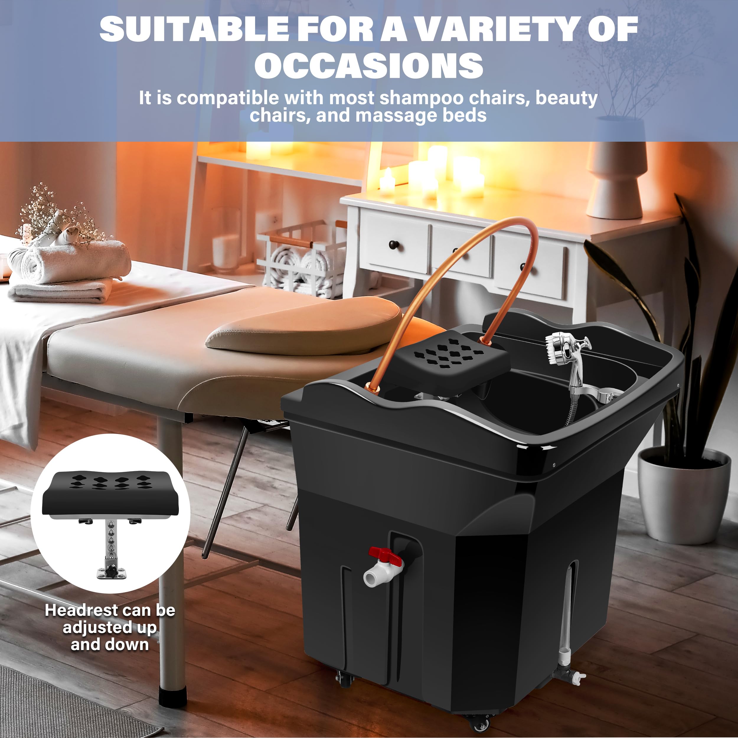 - Ultra-Portable Design:The head spa is equipped with four fixed universal wheels at the bottom.Move effortlessly between stations; perfect for salons, spas, or mobile stylists.Adjustable Headrest – Fits most shampoo chairs & beauty beds for maximum client comfort.