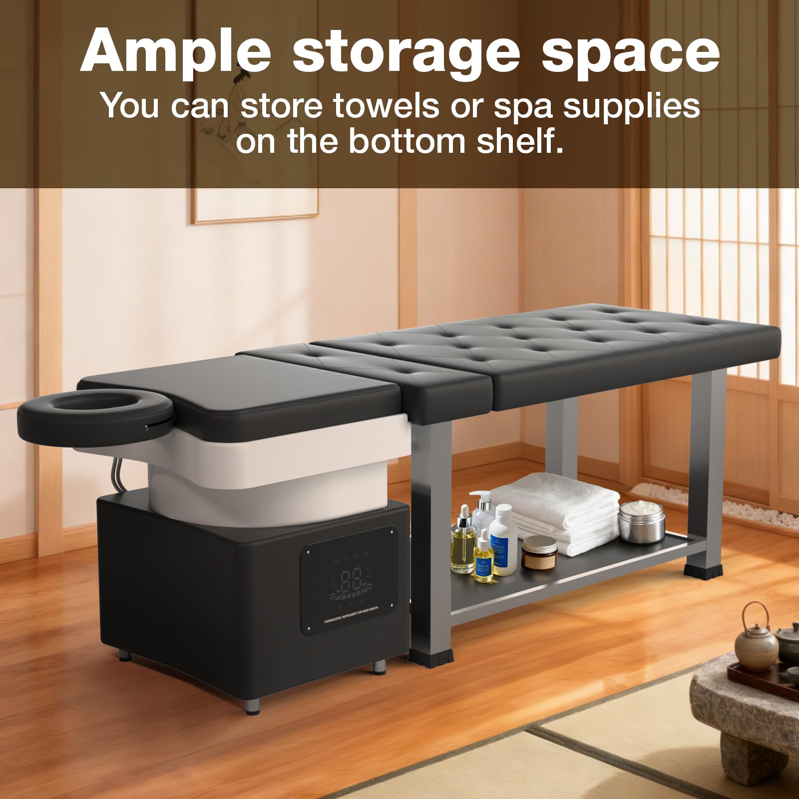- 【Smart Thermostatic Waterfall System】:Experience our precision temperature control system featuring a cascading waterfall and massage shower. The advanced circulation technology automatically maintains your selected temperature range (30°C-55°C/86°F-131°F), delivering consistent hydrotherapy performance for every client