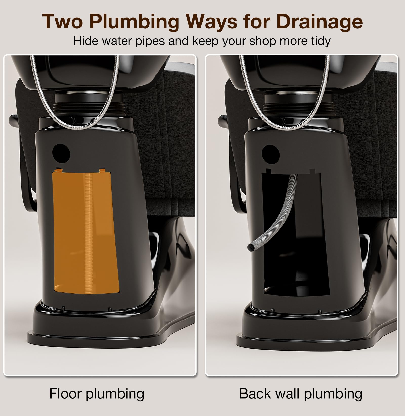 - 【Space-saving Design】Constructed of lightweight stable PP base, the semi-seated design is ergonomic, providing comfort while also saving space in your shop, supports up to 200kg/440lbs. The plumbing goes either from the bottom into the floor, or through the back door to the wall, which you can stand behind stand behind or on the side while shampooing