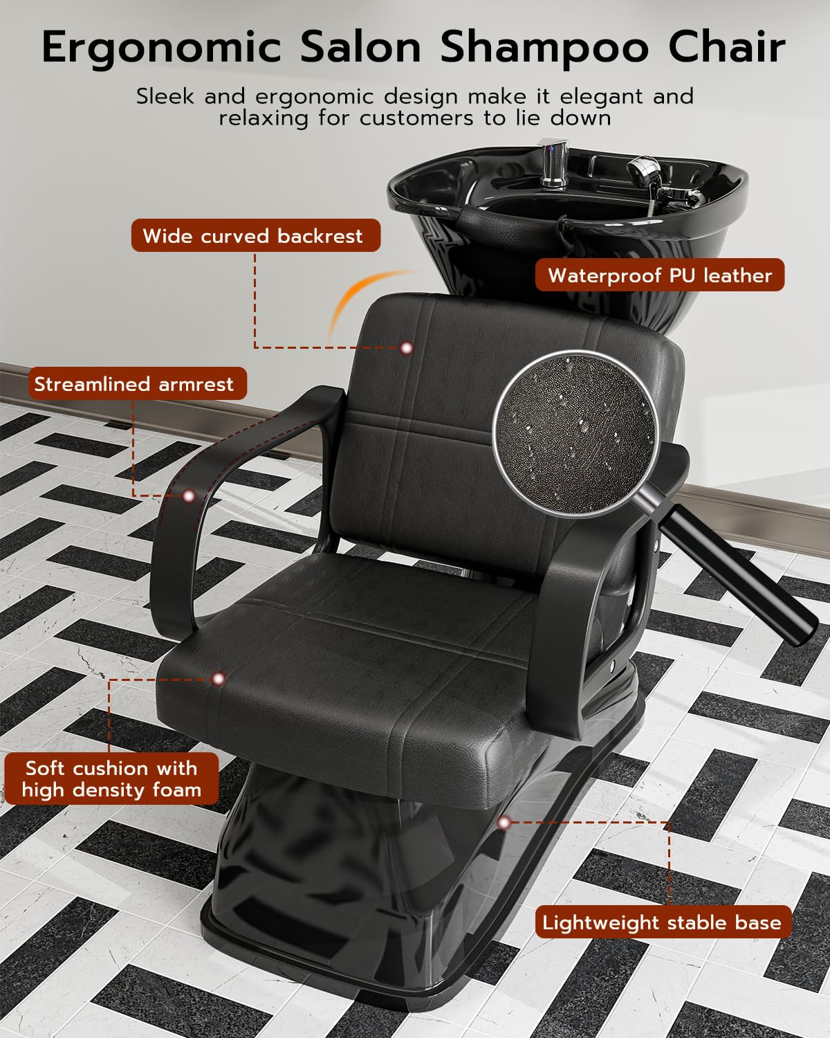 - 【Ergonomic Shampoo Chair Combo】The wood-framed shampoo chair features waterproof PU leather, thick padded cushions, curved armrests and a naturally inclined position, designed not only with elegant appearance, but also with great quality, durability and comfort. The streamlined structure with perfect radian make it relaxing for clients to lie down.