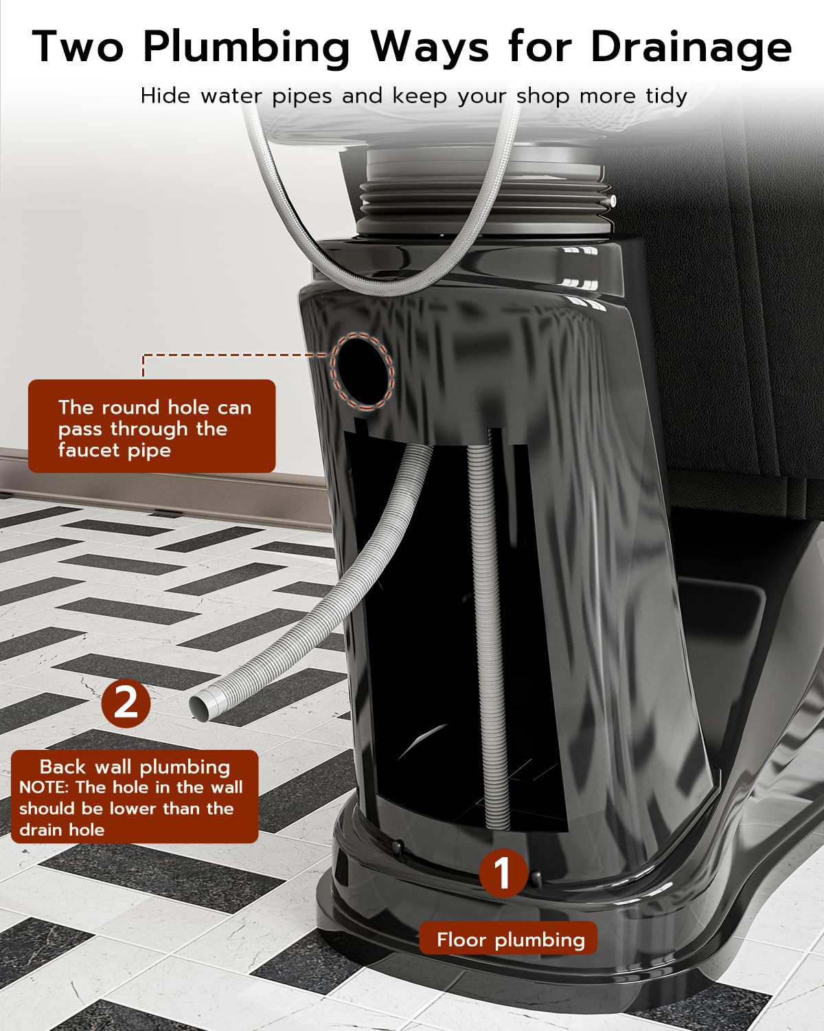 - 【Space-saving Design】Constructed of lightweight stable PP base, the semi-seated design is ergonomic, providing comfort while also saving space in your shop. The plumbing goes either from the bottom into the floor, or through the back door to the wall, which you can stand behind stand behind or on the side while shampooing.