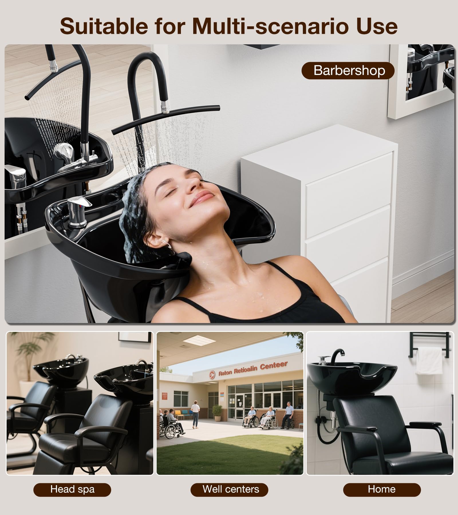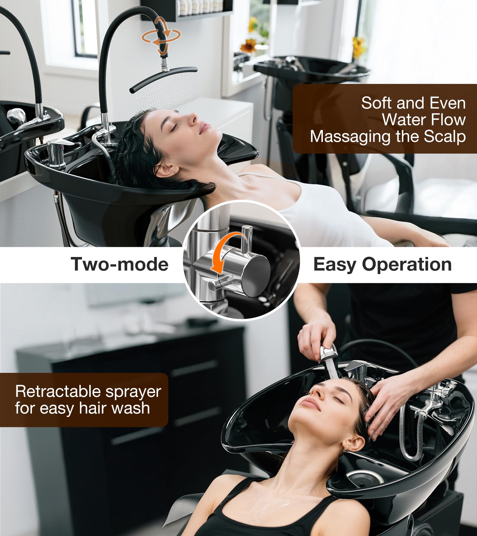 - 【Upgraded Waterfall Head Spa and Sprayer】The unique U-shaped frame structure brings a waterfall-like water flow that acts on the scalp in all directions. The even and gentle water flow can not only rinse the hair but also provide a comfortable massage experience for the scalp. Also, you can free your hands from having to hold the spray nozzle, providing a better service experience for the clients