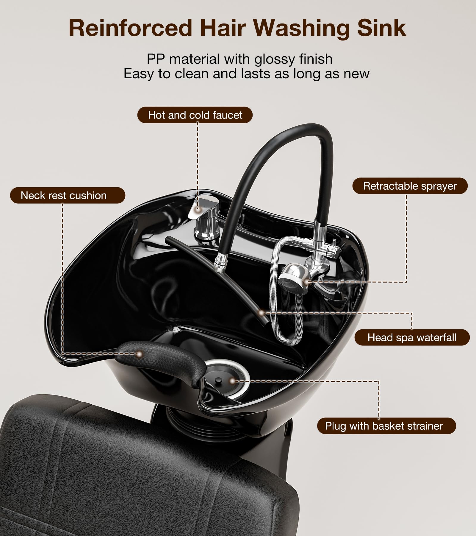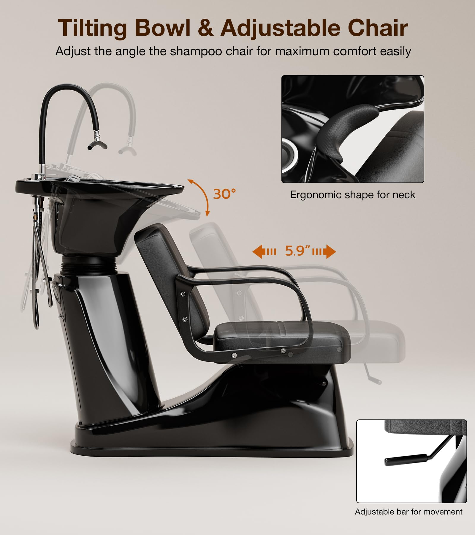 - 【Tilting Shampoo Bowl】PP plastic shampoo bowl features high hardness and a smooth surface. The 30° tilting salon shampoo bowl with adjustable height so you can easily adjust the chair for maximum comfort. Includes hot and cold faucet, retractable sprayer, neck rest cushion and drain hose. We help you save the hassle to purchase the parts separately