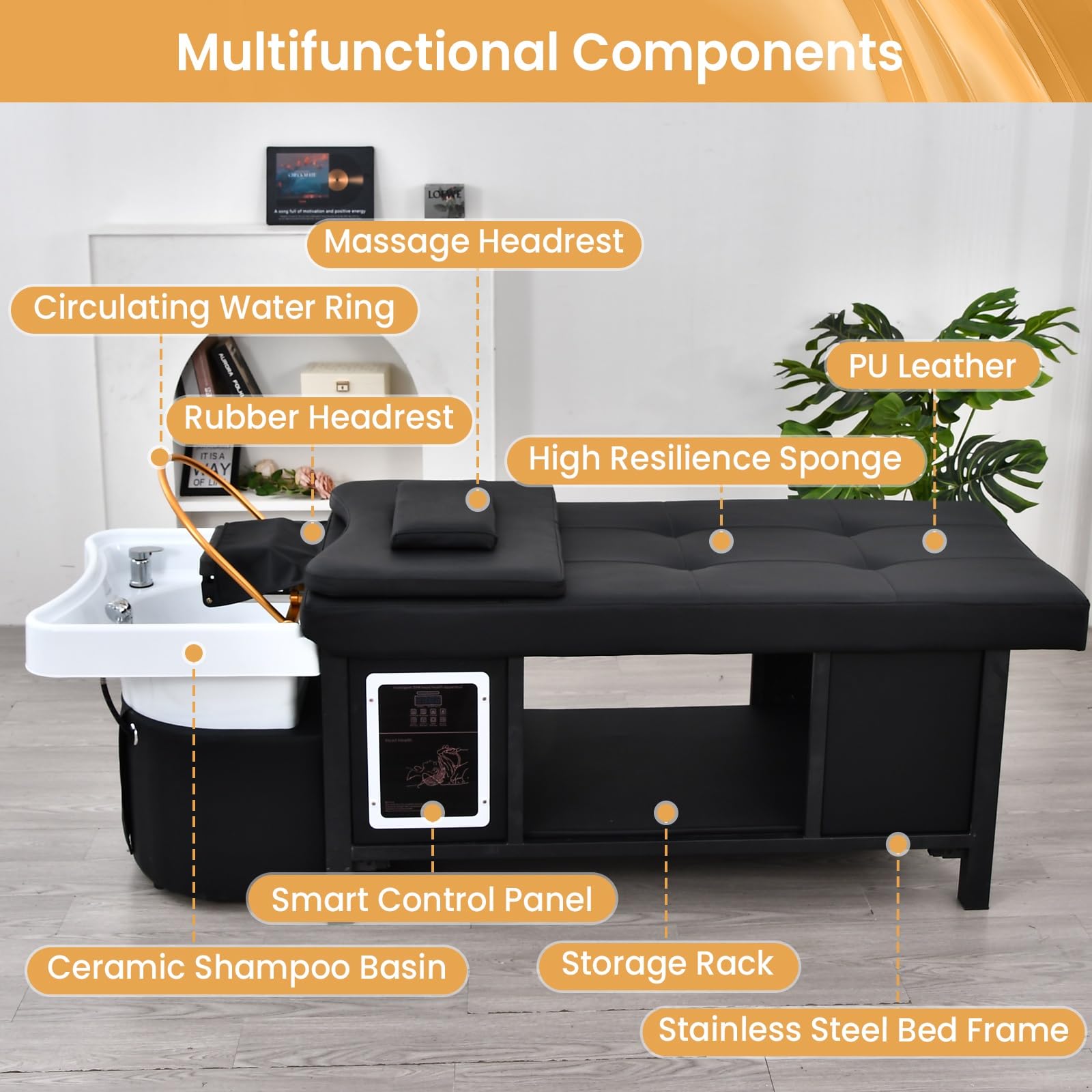 - Durable Material & Solid Construction of Massage Table: Crafted from stainless steel, acrylic basins, waterproof PU leather, and sponge, this massage bed is built to last, resisting wear and simplifying sanitation. The large under-bed storage keeps towels, tools, and spa supplies neatly organized, keeping your space organized. The esthetician bed with head spa equipment is ideal for professional beauty spa equipment setups