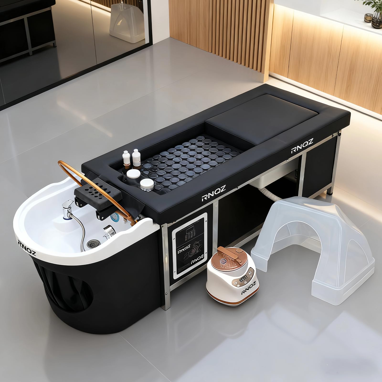 - High Quality Material Selection: This japanese head spa equipment is made of stainless steel frame/plastic frame, acrylic shampoo basin and PU leather, with a stable structure and excellent load-bearing capacity. The smooth acrylic shampoo basin of head spa equipment is easy to clean and maintain, while the wear-resistant PU leather and high-density sponge ensure the ultimate comfort during use