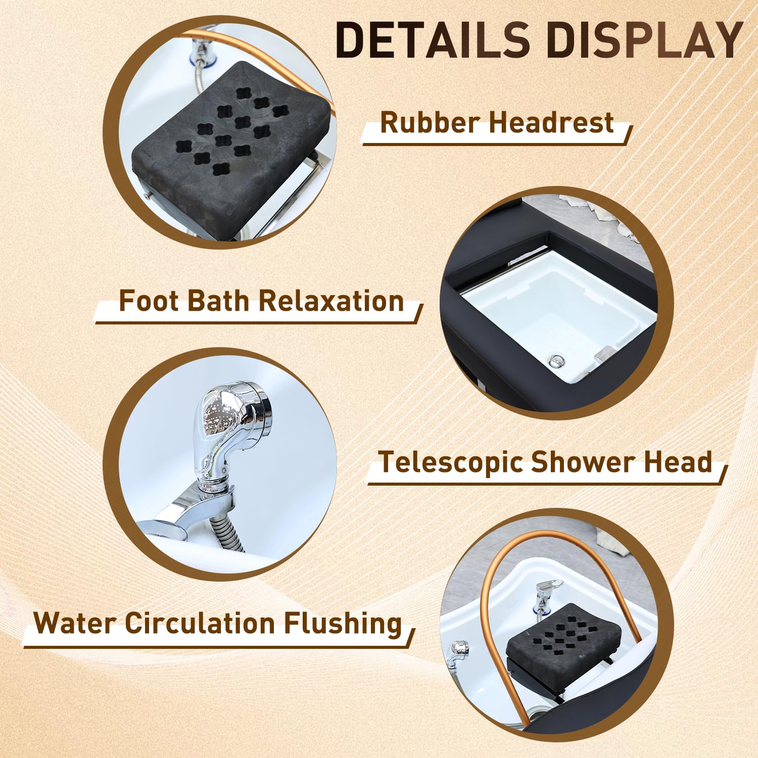 - Fully Automatic Water Circulation System: The head basin of the shampoo bed includes a water circulation frame with a waterfall outlet and a shower with massage function, which can automatically complete the water circulation after startup. The built-in circulator will heat the water to the appropriate temperature you set, 30°C to 55°C