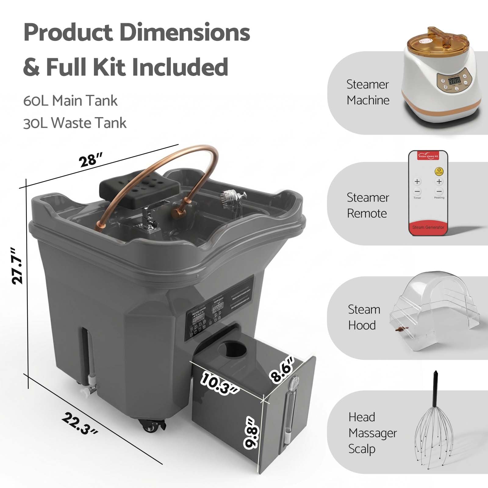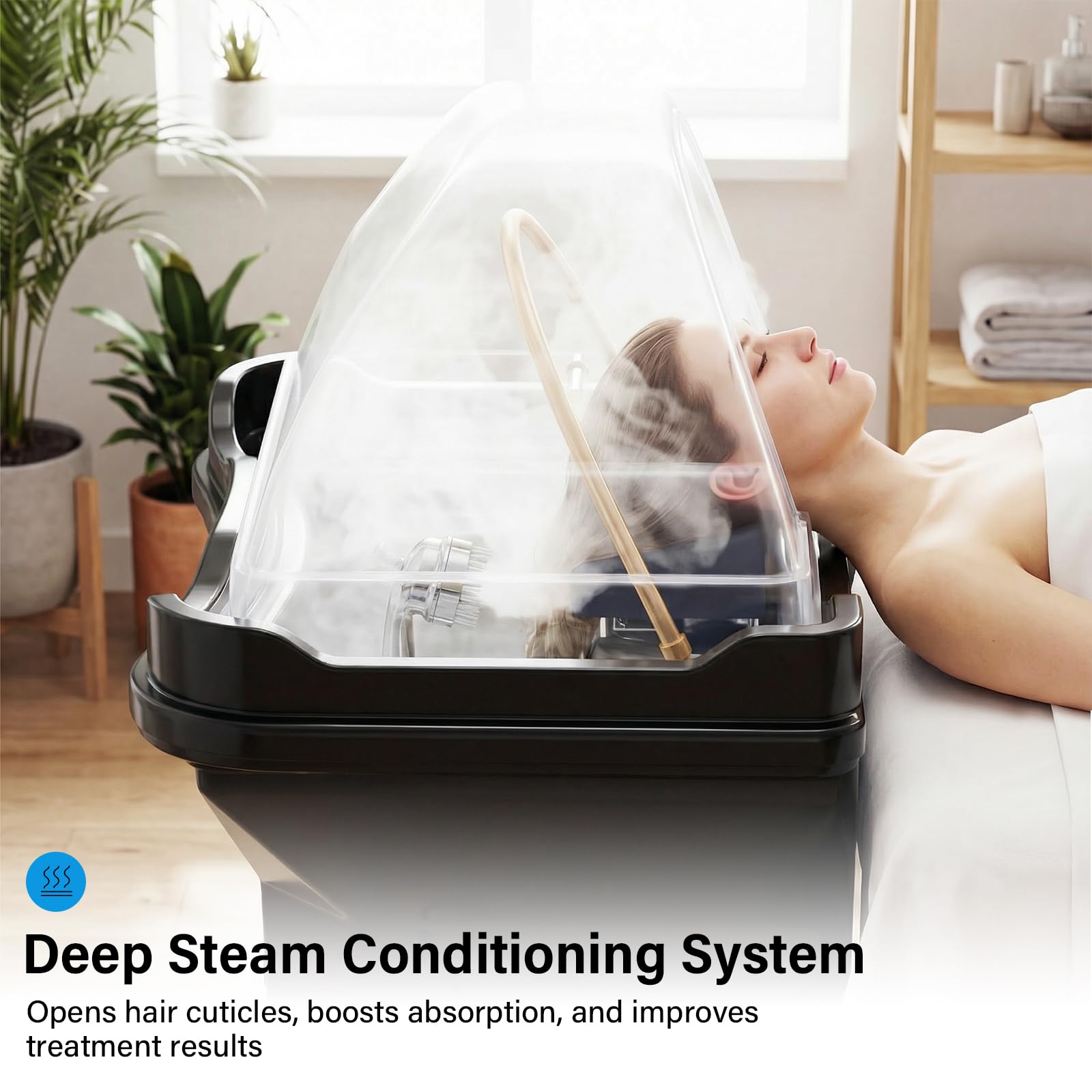 - 【Steam & Fumigation Therapy】A complete steam-therapy setup with a spa basin, steam generator, and fumigation hood delivers deep, warming steam to the scalp. You can add herbal blends or scalp-care essences to enhance hydration, open pores, boost circulation, and elevate the overall care experience.