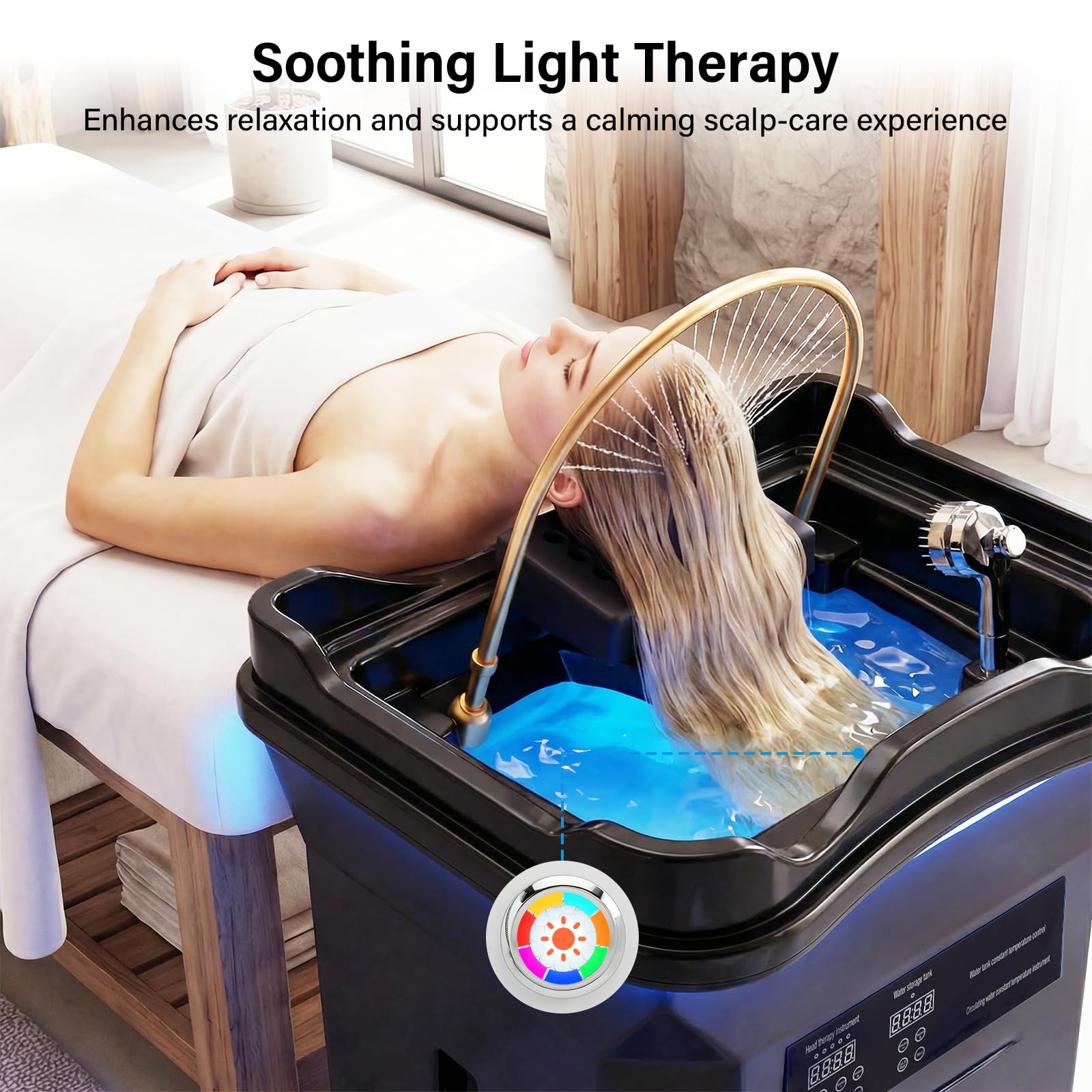 - 【Light Therapy for Scalp Care】 Built-in LED chromotherapy provides gentle, multi-color light treatment to nourish the scalp, promote relaxation, and create a premium atmosphere during treatments.