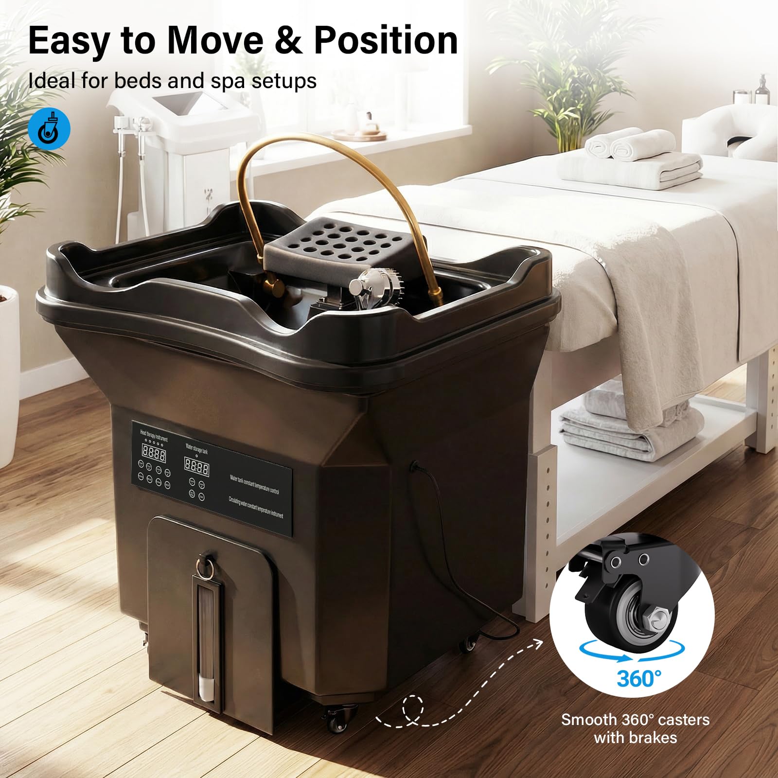 - 【Portable Head Spa Equipment】Designed for flexible salon use, this portable head spa device features lockable wheels for smooth movement and stable positioning—ideal for beauty salons, home services, and wellness studios.