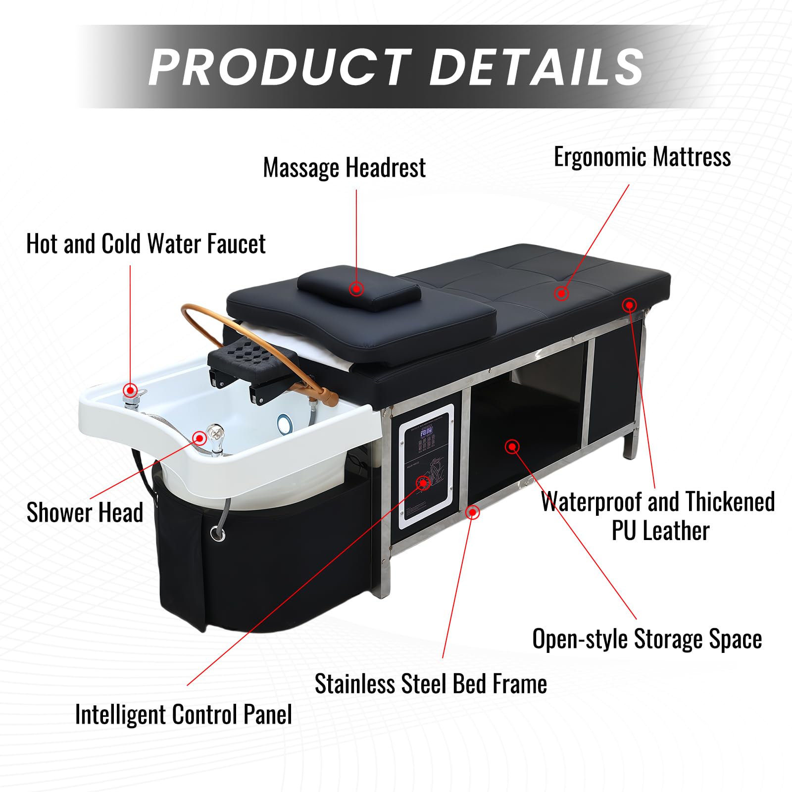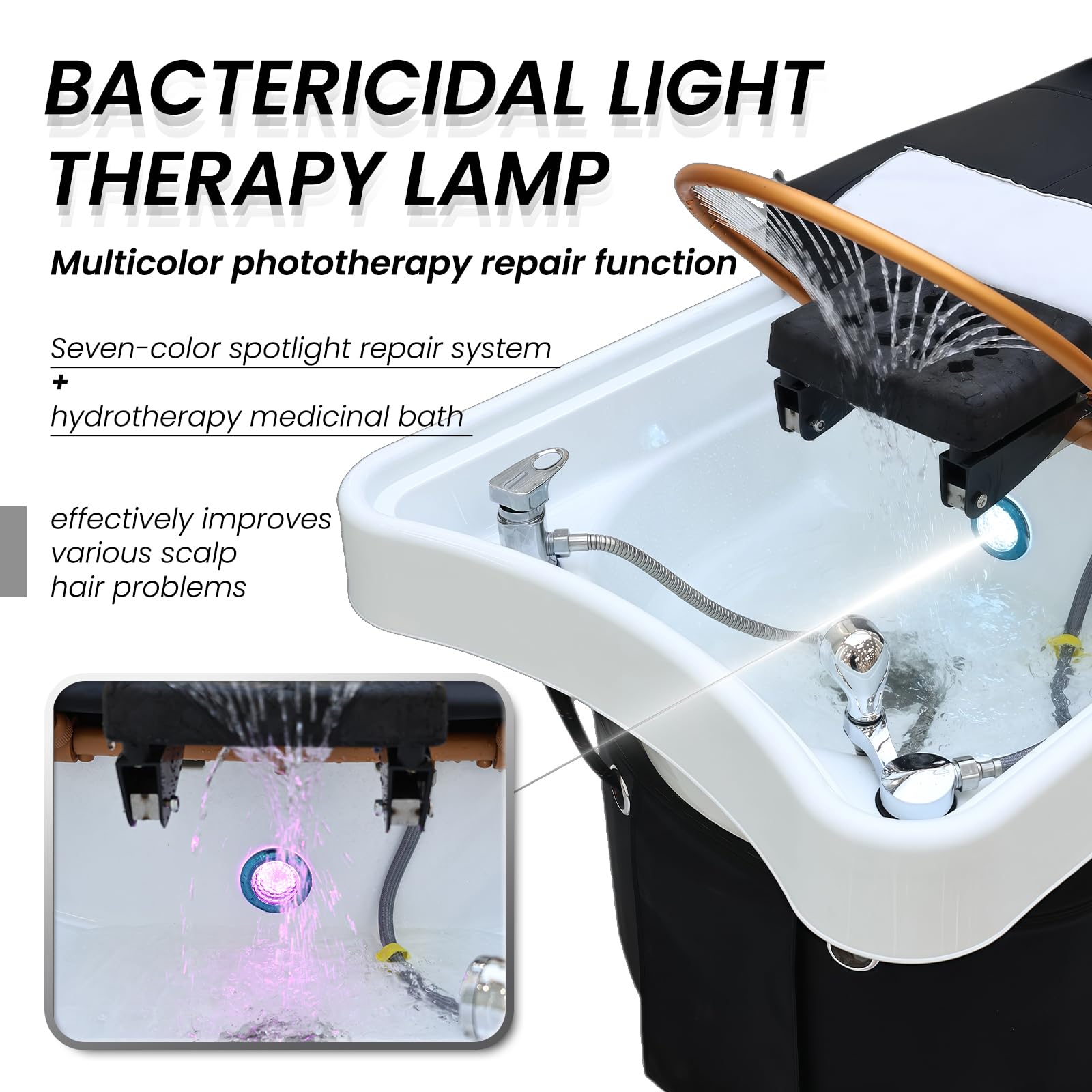 - LED Light Therapy for Scalp & Hair Health:Boost hair vitality with 4-color LED light therapy (blue, purple, green, cyan). Each light targets specific concerns: scalp detox, hair growth stimulation, stress relief, and oil regulation. A spa-grade add-on to elevate standard shampoo services into rejuvenating holistic treatments.