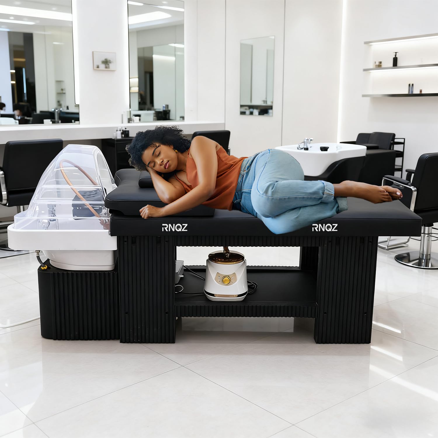- Head Spa Bed: This head spa bed features a curved shampoo bowl that prevents water splashing and hair tangling. The body-contouring design supports neck and shoulders for a relaxing posture. As a massage bed, it ensures comfort for all body types, enhancing the head spa experience with its human-centric approach
