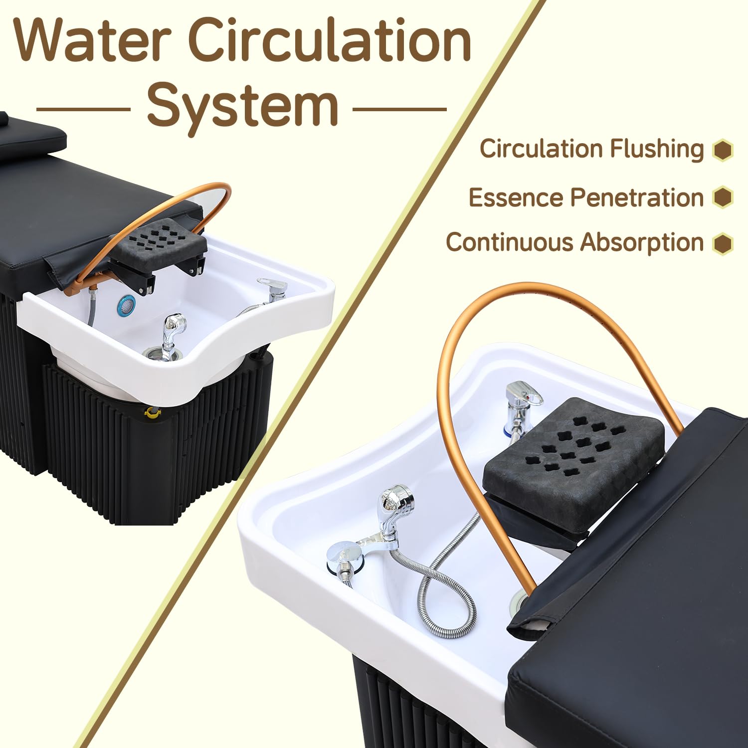 - Head Spa Equipment: During the water circulation, the gentle yet powerful water circulates through the hair, massaging the scalp and promoting blood circulation in the head. The head spa bed is adjustable, allowing you to customize the height and angle to suit your salon space and provide clients with the best possible comfort during their treatment