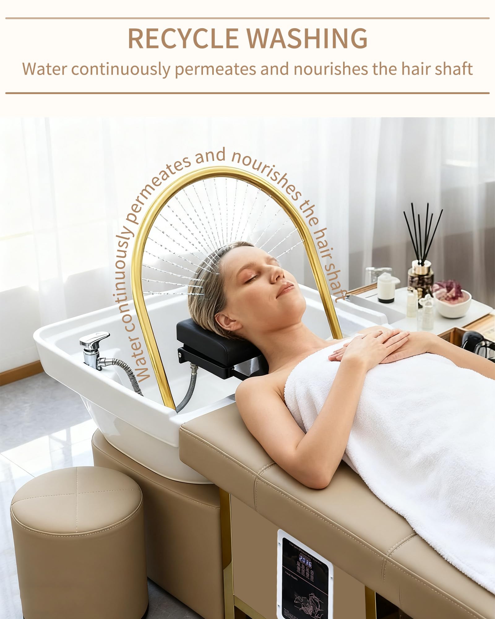 - 【Advanced Water Circulation & Drainage System】: Enjoy a gentle, waterfall-like water flow for a clean and soothing shampoo experience with this shampoo bed. It easily connects to water pipelines for one-touch drainage, maintaining salon hygiene. Combined with the hair steamer function, it ensures efficient hair care. Perfect for shampoo bowls and head spa sessions, this feature supports a hygienic and comfortable wash.