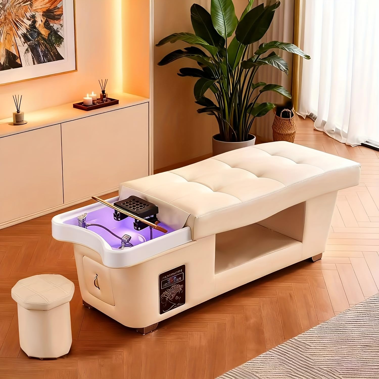 - [Sturdy structure]: Crafted from stainless steel, acrylic basins, waterproof PU leather, and sponge, this massage bed is built to last, resisting wear and simplifying sanitation. The large under-bed storage keeps towels, tools, and spa supplies neatly organized, keeping your space organized. The esthetician bed with head spa equipment is ideal for professional beauty spa equipment setups