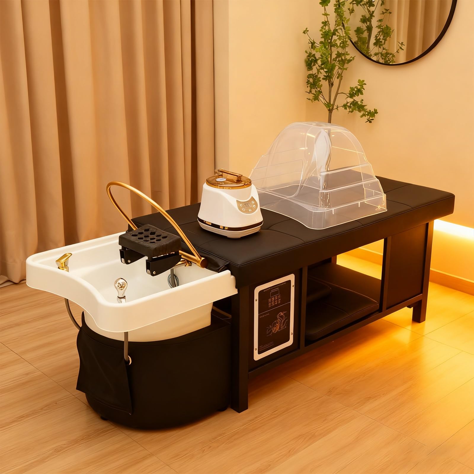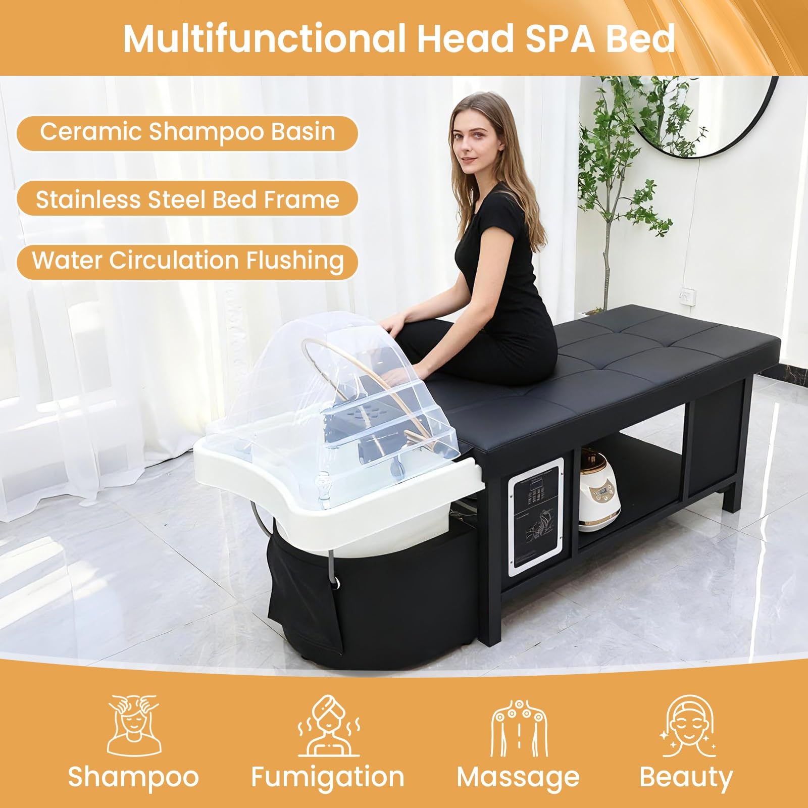 - Durable Material & Solid Construction of Massage Table: Crafted from stainless steel, acrylic basins, waterproof PU leather, and sponge, this massage bed is built to last, resisting wear and simplifying sanitation. The large under-bed storage keeps towels, tools, and spa supplies neatly organized, keeping your space organized. The esthetician bed with head spa equipment is ideal for professional beauty spa equipment setups