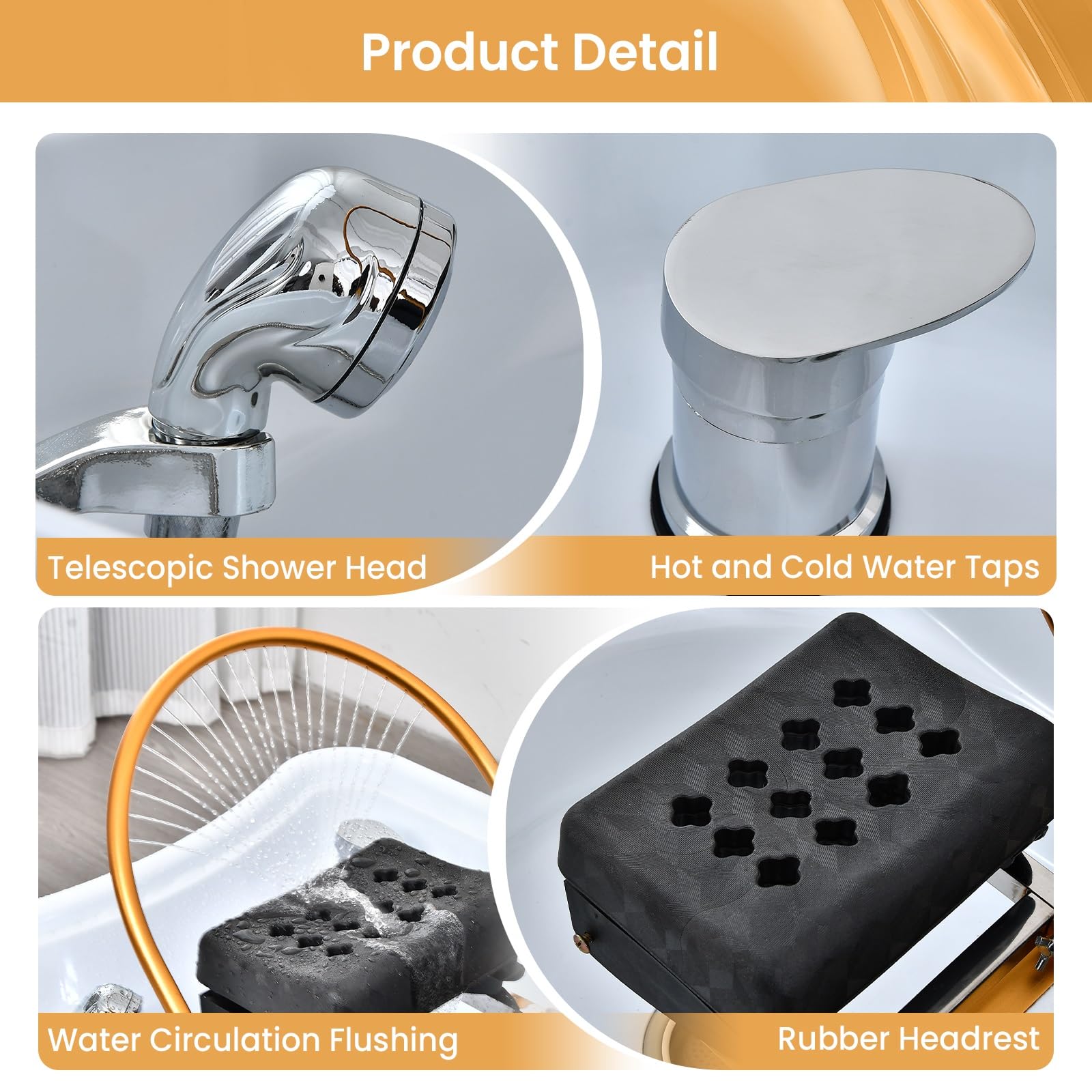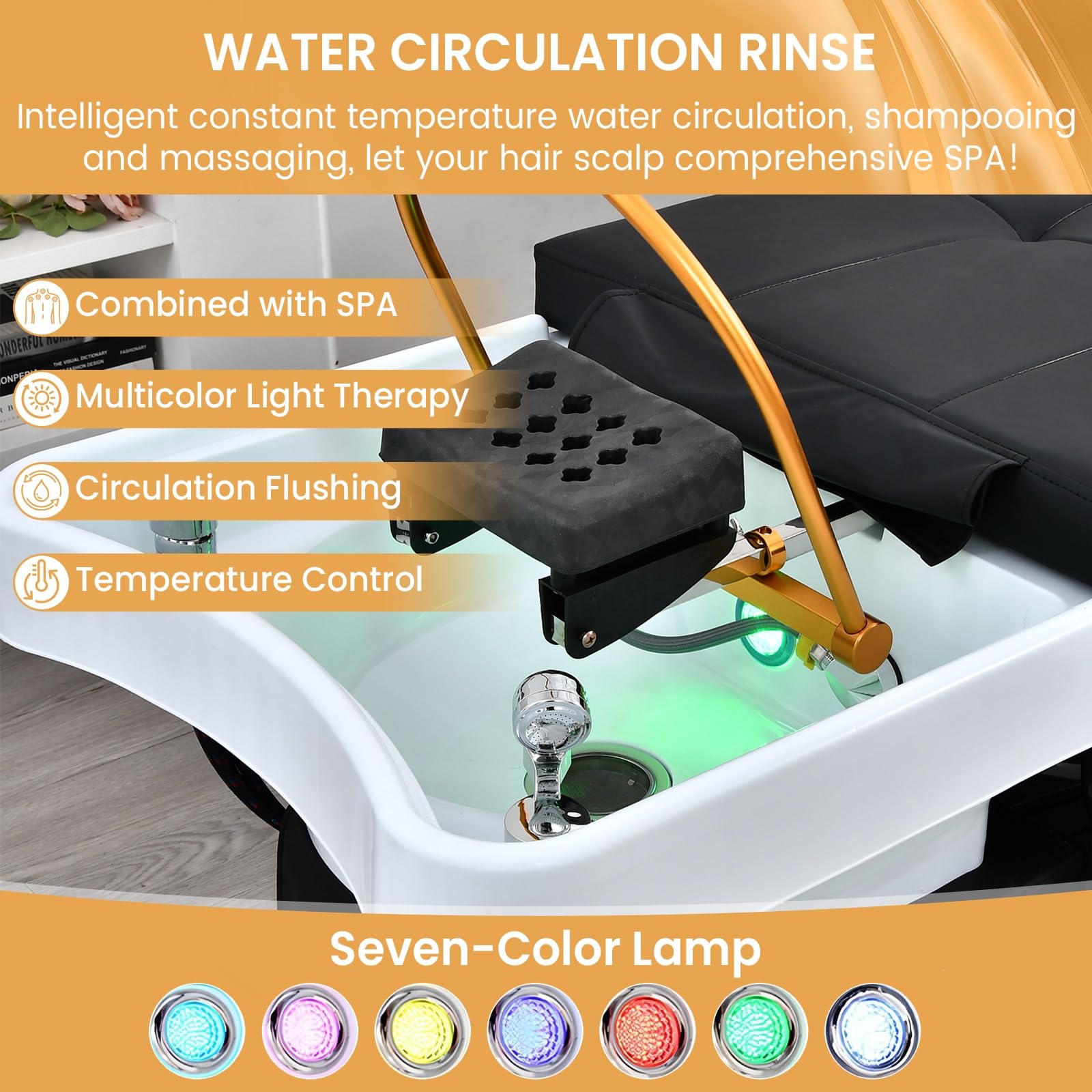 - Massage Table with Head Spa Equipment: The massage bed features a U-shaped shampoo basin with 25 evenly spaced water hole, designed to mimic a natural waterfall flow for a scalp-spa experience. This esthetician bed connects easily to water pipelines for effortless one-touch drainage, maintaining salon cleanliness. The ergonomic shampoo bowl prevents splashing, keeping clothes dry. Enhanced with 7-color LED lights, it creates a calming atmosphere for head spa treatments