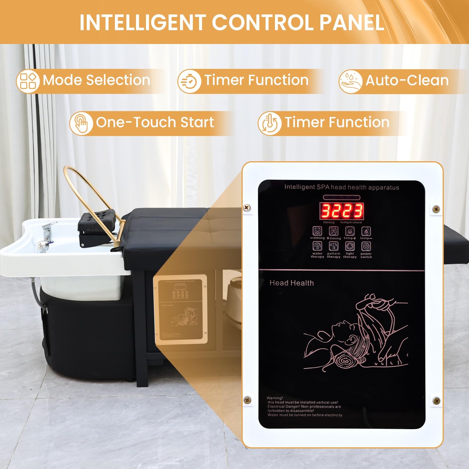 - Smart Touch Control: The intuitive touch panel on this spa beds & tables with japanese head spa equipment, allowing precise adjustment of time and water temperature, massage modes, fumigation, and timer settings. Technicians can easily customize treatments for hair steamer functions, with auto-shutoff for safety. This head spa bed streamlines services in beauty salons or spa centers, making the spa table user-friendly and efficient for daily use