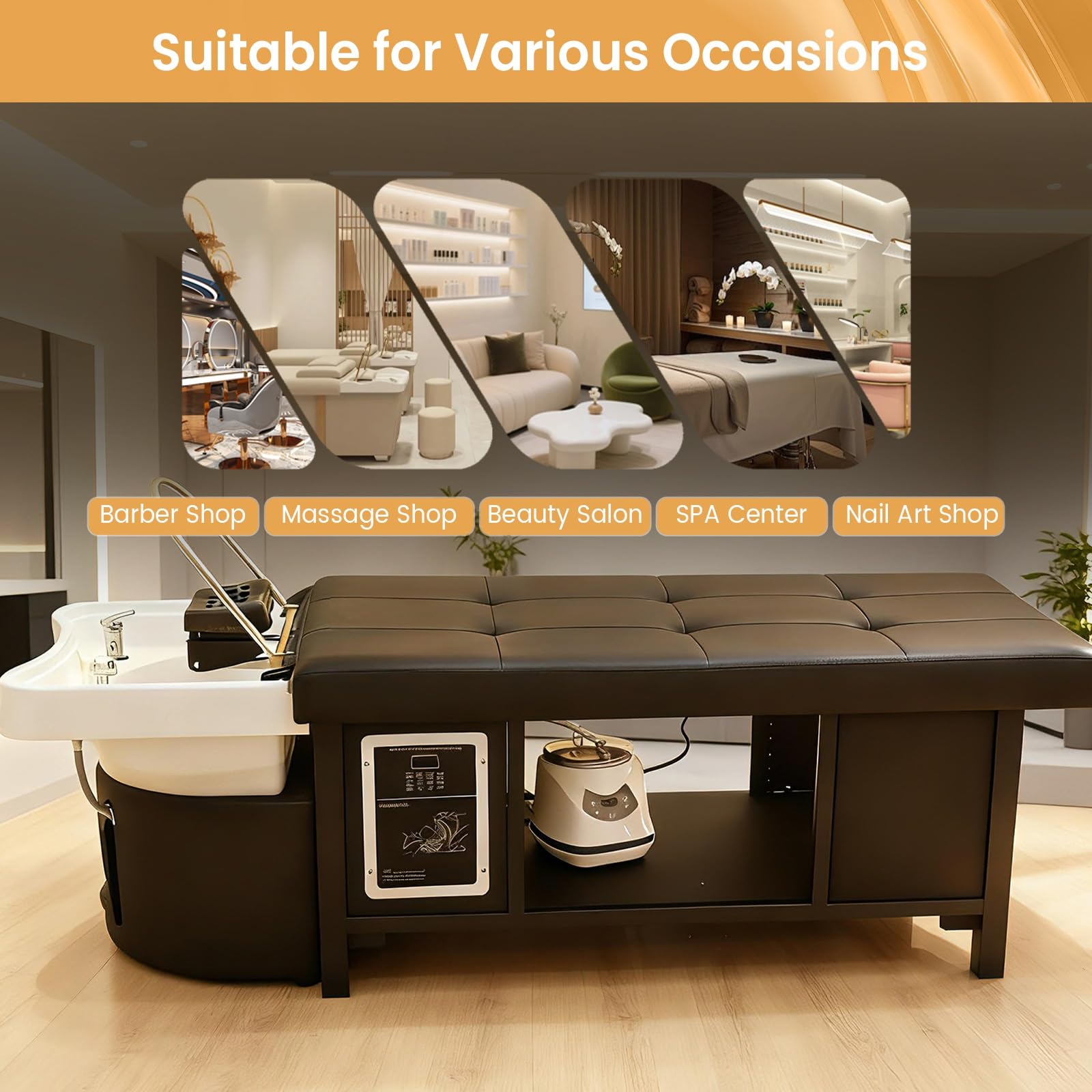- All-in-One Relaxation & Therapy Massage Table: The esthetician bed can be used as a head spa equipment and easily transformed into a massage bed. Elevate your salon or spa with the versatile head spa that integrates hair care massage, head/facial fumigation, comprehensive body care into one compact unit. The spa bed is perfect for beauty salons, massage parlours, barbershops and luxury spas, making it easy to enhance customer experience, and even perfect for home use
