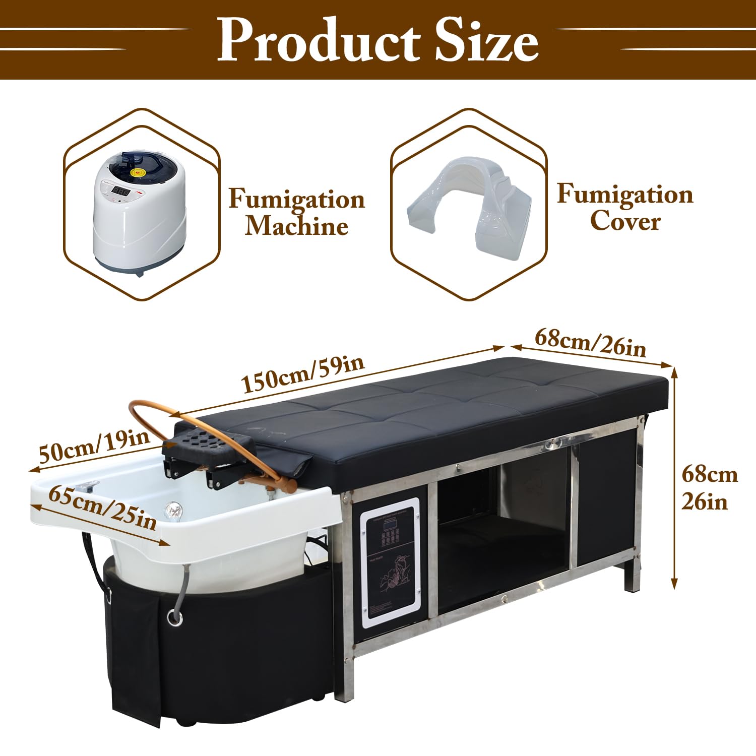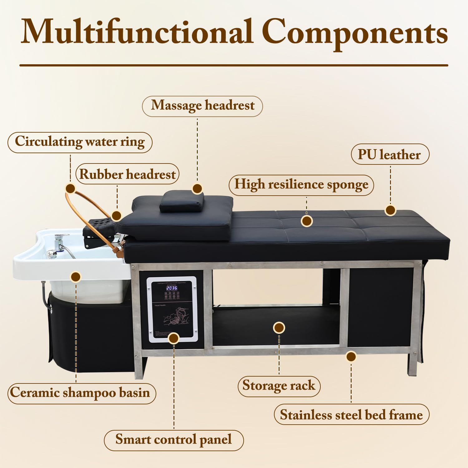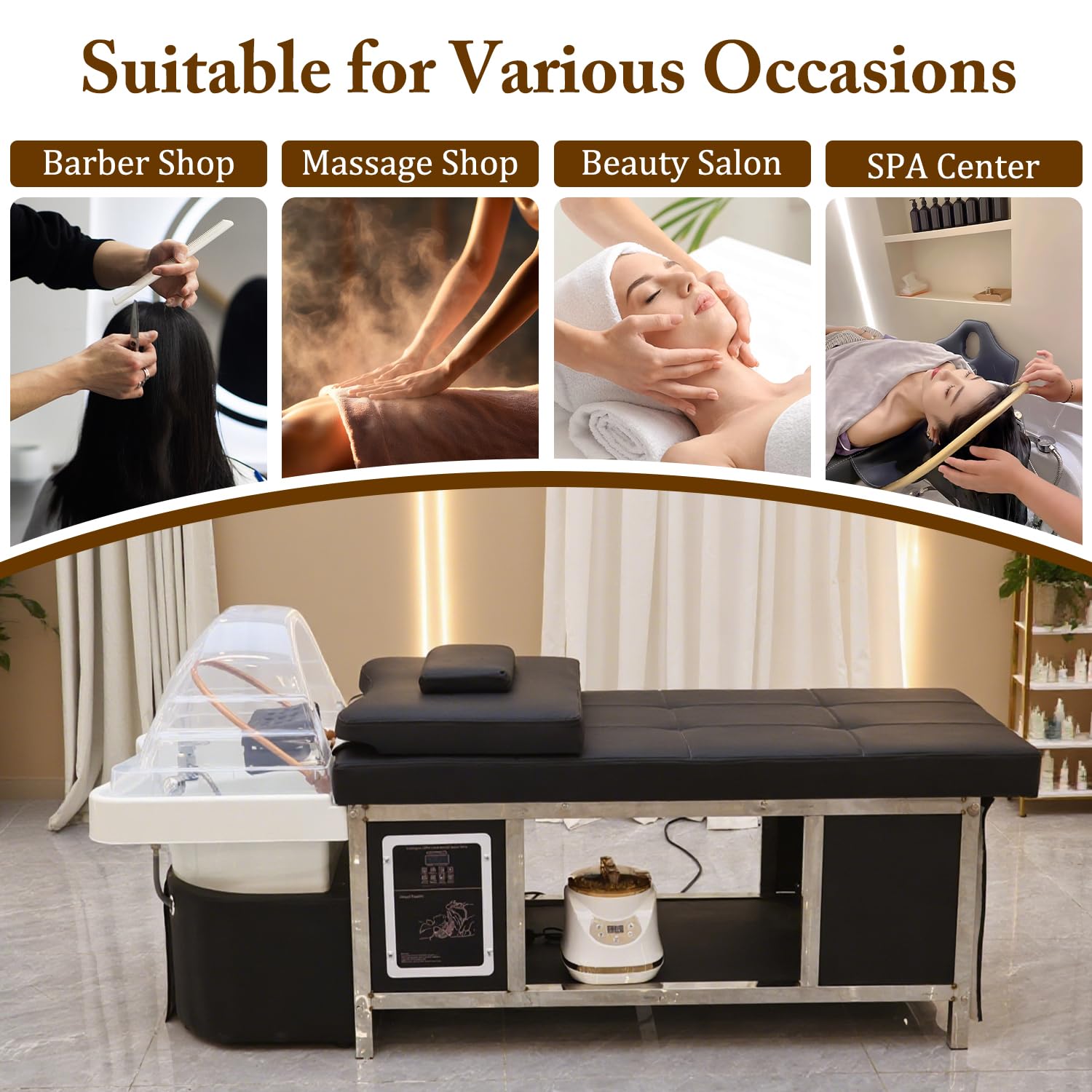 - Steaming & Hydrotherapy Care : Enjoy simultaneous head steaming and head spa equipment-grade water circulation massage to relax muscles and boost circulation. Ideal for professional salons or home use. The ergonomic open headrest with face hole and memory foam pillow ensures comfort during extended treatments. Transition seamlessly from shampooing to steam therapy or massage—all on a waterproof, PU leather bed for easy cleanup.