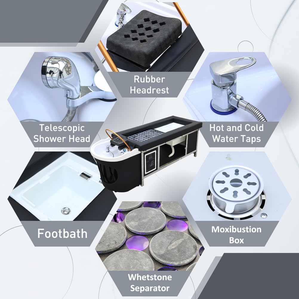 - Multifunctional Head Care Bed Set : This massage shampoo bed not only provides all-in-one shampooing and hair care services, but also features a foot bath, light therapy, and steaming functions. Enjoy a relaxing scalp massage while using blue, purple, green, and cyan light to improve your scalp and hair