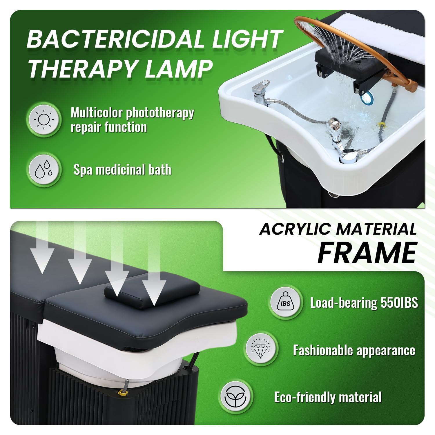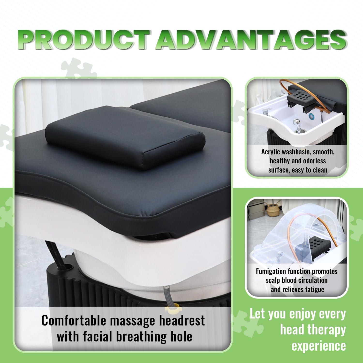 - Shampoo Massage Bed with Head Spa Equipment: The head spa bed features a U-shaped shampoo basin with 25 evenly spaced water hole, designed to mimic a natural waterfall flow for a scalp-spa experience. This esthetician bed connects easily to water pipelines for effortless one-touch drainage, maintaining salon cleanliness. The ergonomic shampoo bowl prevents splashing, keeping clothes dry.