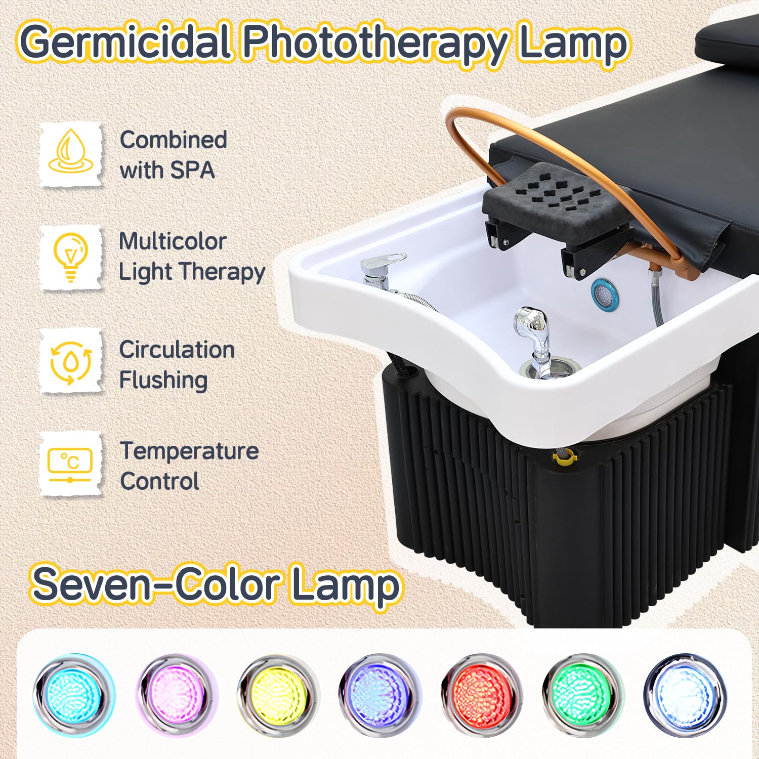 - Selected Materials : The massage spa equipment is made of plastic frame, acrylic shampoo basin and PU leather, with a stable structure and excellent load-bearing capacity. The smooth acrylic shampoo basin is easy to clean and maintain, while the wear-resistant PU leather and high-density sponge ensure the ultimate comfort during use