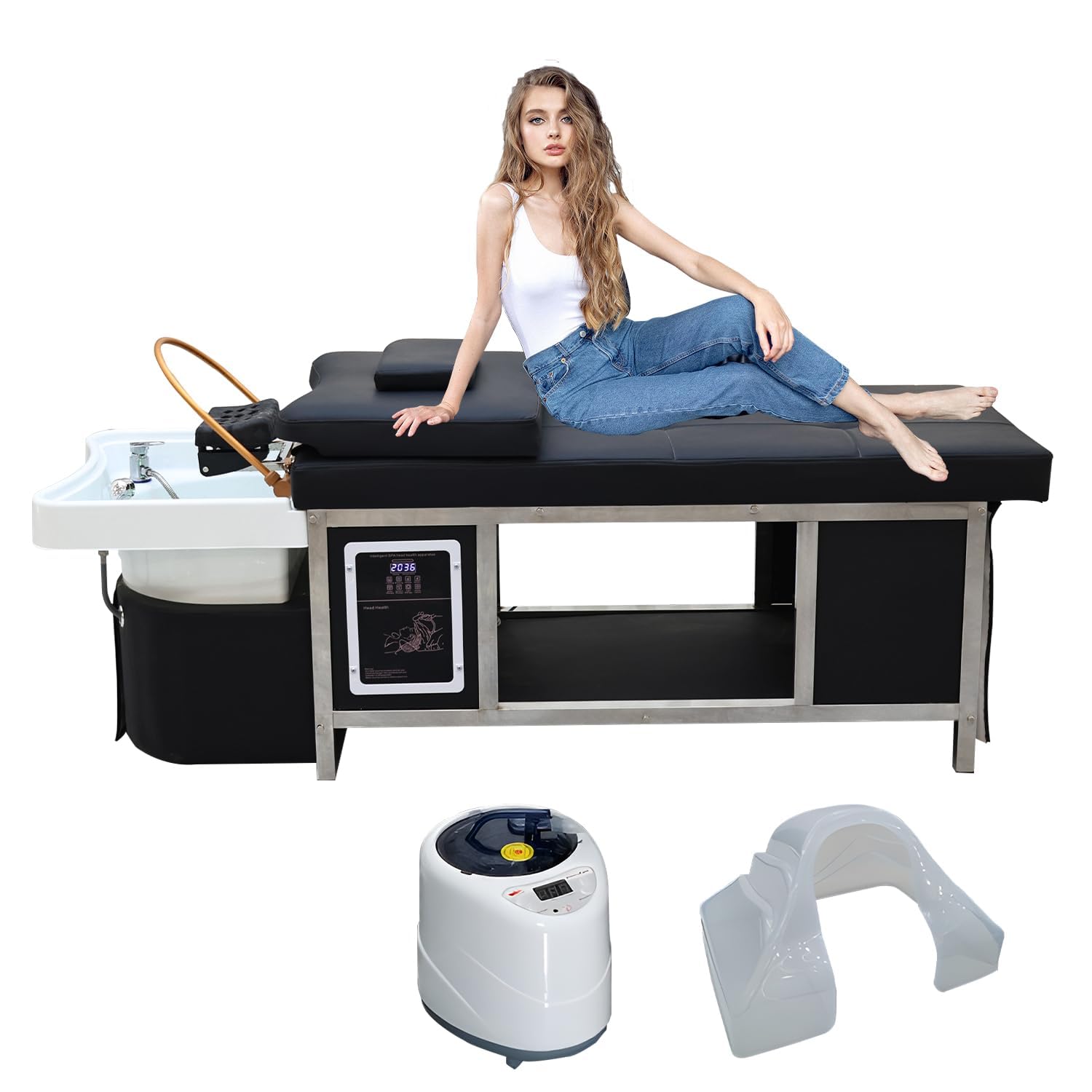 - Multi-functionality: Easily adjustable temperature and time settings make it accessible for both professionals and clients, ensuring a hassle-free and enjoyable operation. Redefine the salon experience by seamlessly transitioning the basin into a massage bed. The included pillow, complete with a face hole, transforms the basin into a versatile space