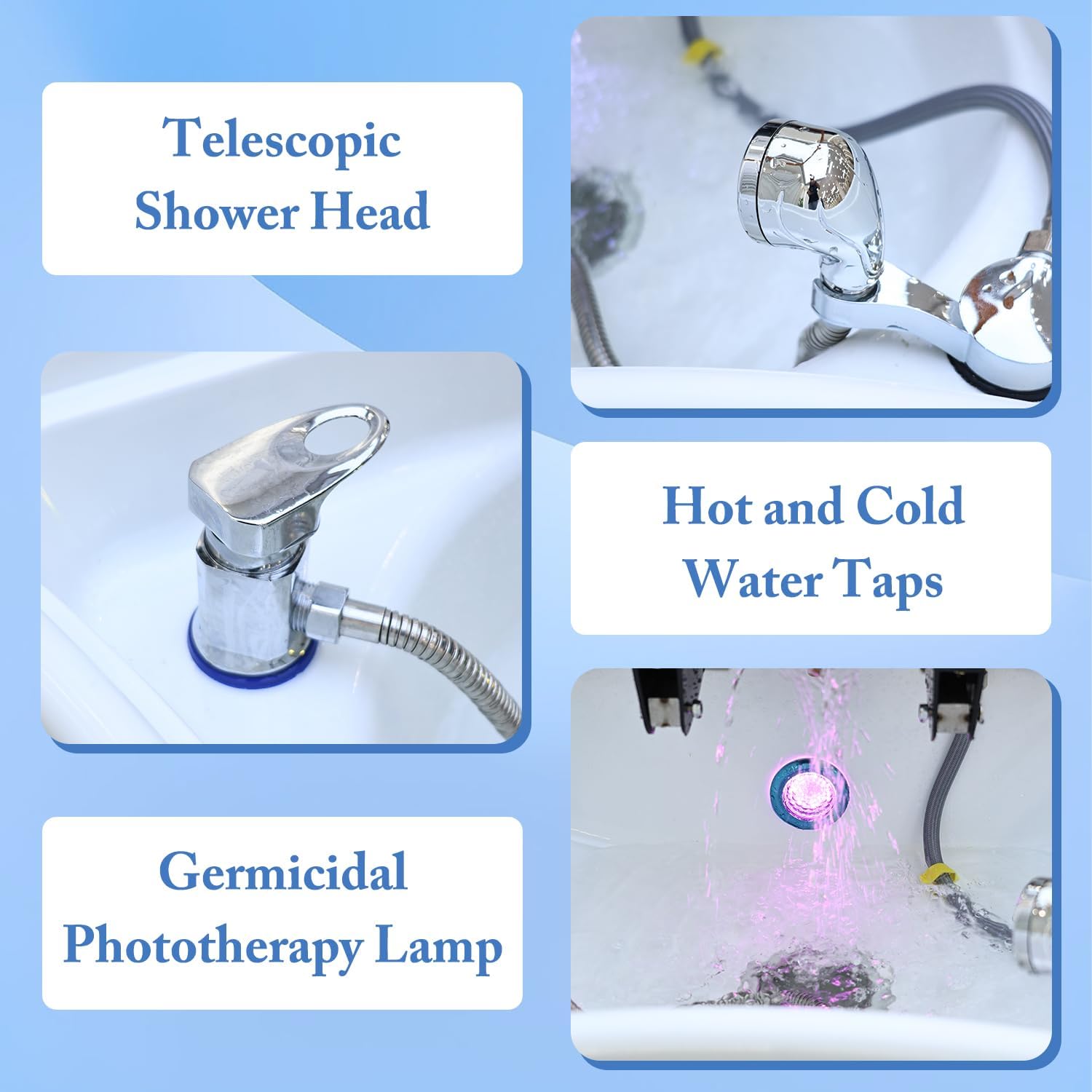 - LED Light Therapy :This Shampoo Massage Bed can provide your head with multi-color light therapy while you wash and massage your hair. The blue light, purple light, green light, and cyan light can improve your scalp and your hair, regulate your hair and scalp, improve your hair quality, and relax your brain
