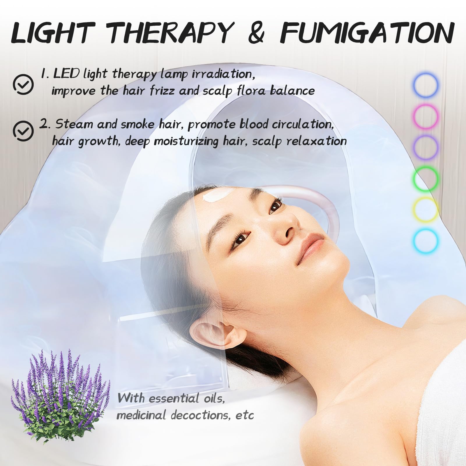 - Light Therapy Steaming Function: The use of LED light therapy lamp irradiation, can improve hair frizz and scalp flora balance, oil blockage, metabolic balance, promote hair growth; Steaming hair can promote blood circulation, hair growth, deeply moisturize hair, repair damaged hair, and relax the scalp.