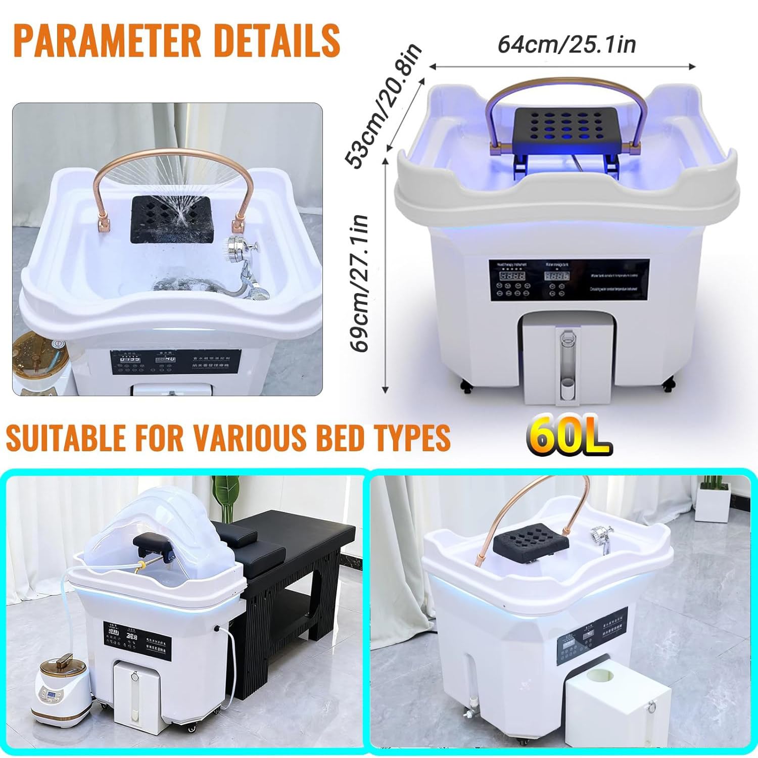 - 1️⃣ 【Pro Mobile Hair Spa Station with 60L Clean Water & 20L Waste Tank】Experience ultimate convenience with the upgraded mobile water circulation head spa equipment featuring a 60L clean water tank and a 20L built-in waste tank—no external drainage or messy buckets required! Thermostatic water (30°C–55°C) ensures perfect comfort, and 360° lockable wheels allow effortless movement in tight salon spaces. Compatible with standard chairs (62–72cm). Perfect for home salons, mobile stylists, and professional spa setups.