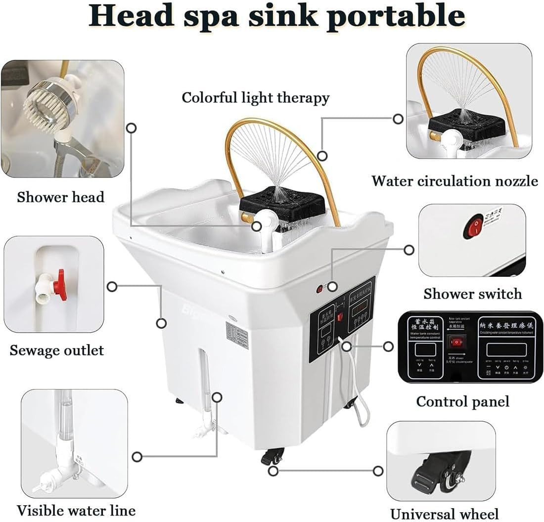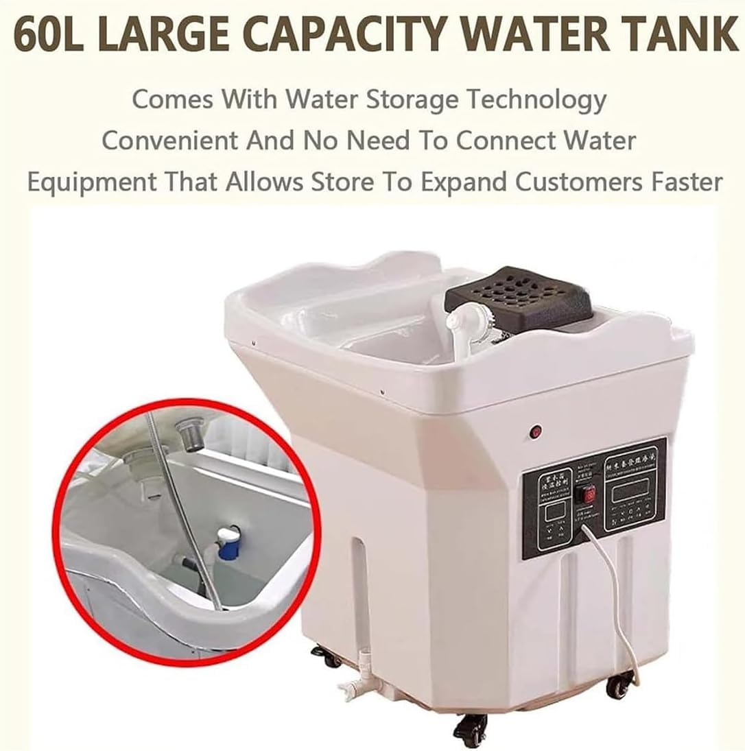 - ★【Professional Ergonomics】Ergonomic headrest, comfortable head support; Cascading water jet + massage jet to promote scalp microcirculation; 60L large-capacity water tank to meet long-term care needs. Portable design suitable for beauty beds and hairdressing chairs from 62 to 72 cm.