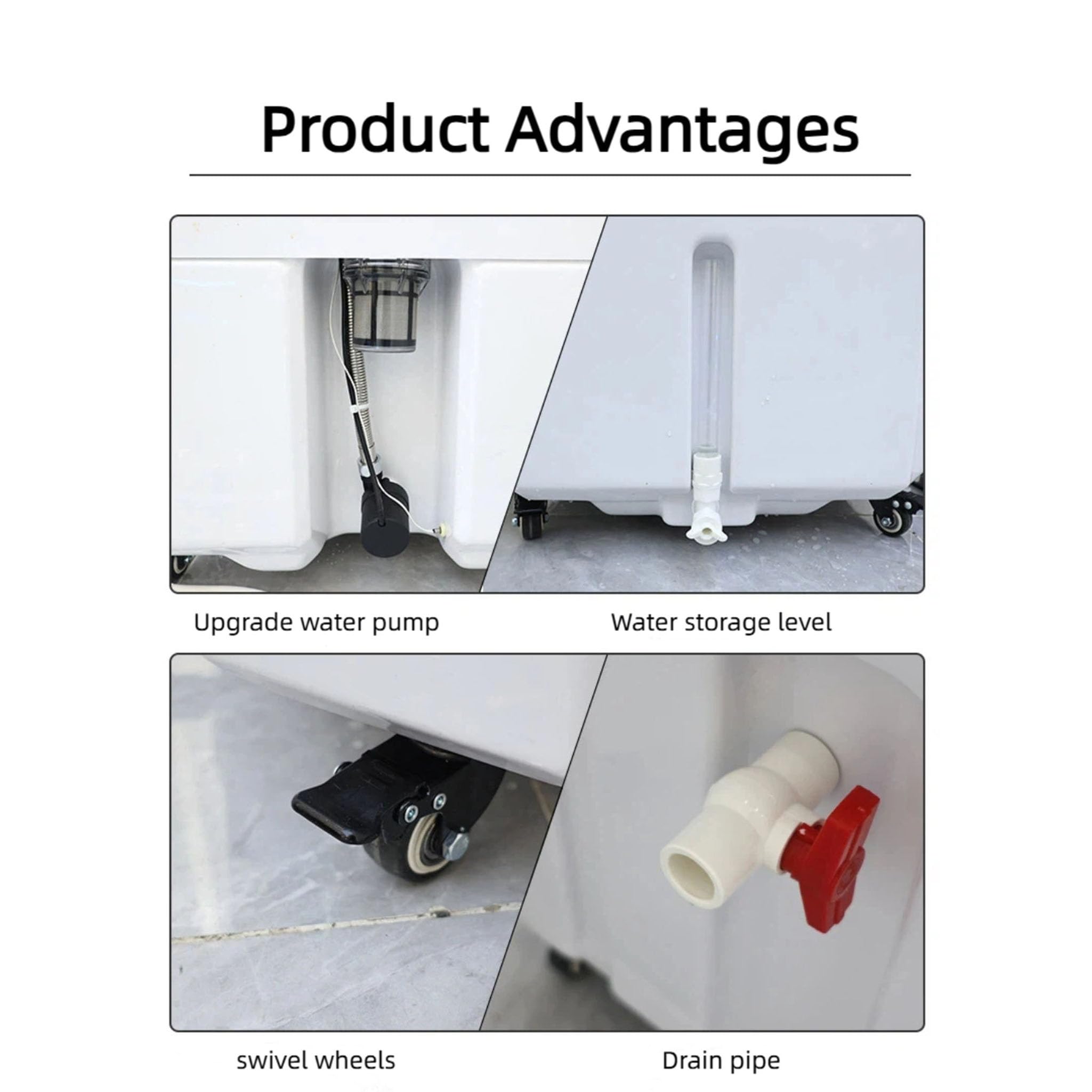 - 【60L water tank】: The head spa device comes with a 60L water tank, and no external pipes are required. When in use, block the drain at the bottom of the head basin and add water into the water tank. Only pure water can be added to the water tank, and observe the water level tube to prevent water from overflowing.