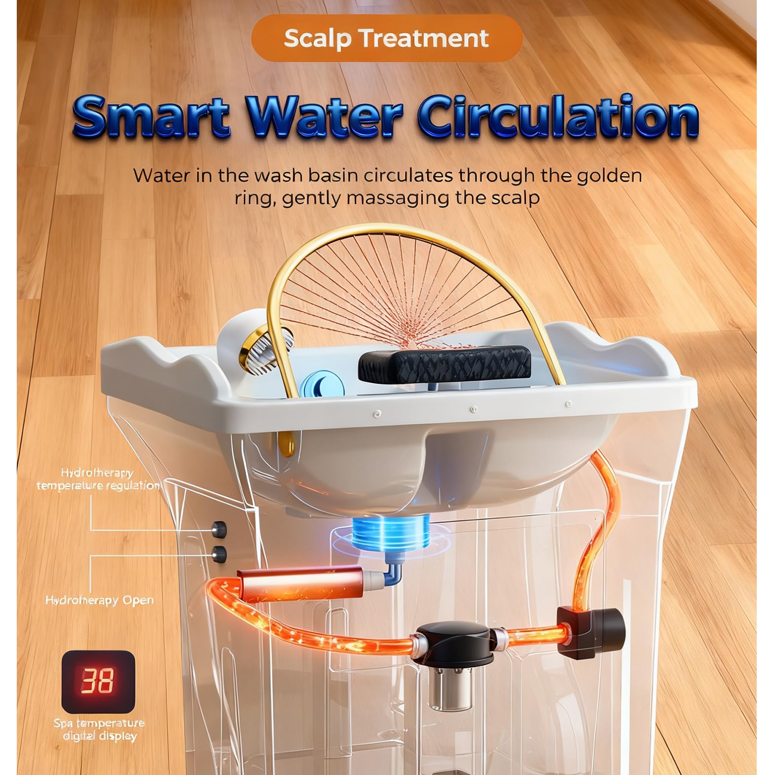 - 【Constant temperature water circulation】: The head spa device includes a frame with a waterfall outlet and a nozzle with a massage function, both of which automatically circulate water. The built-in circulator heats the water to the temperature you set (30°C to 55°C).