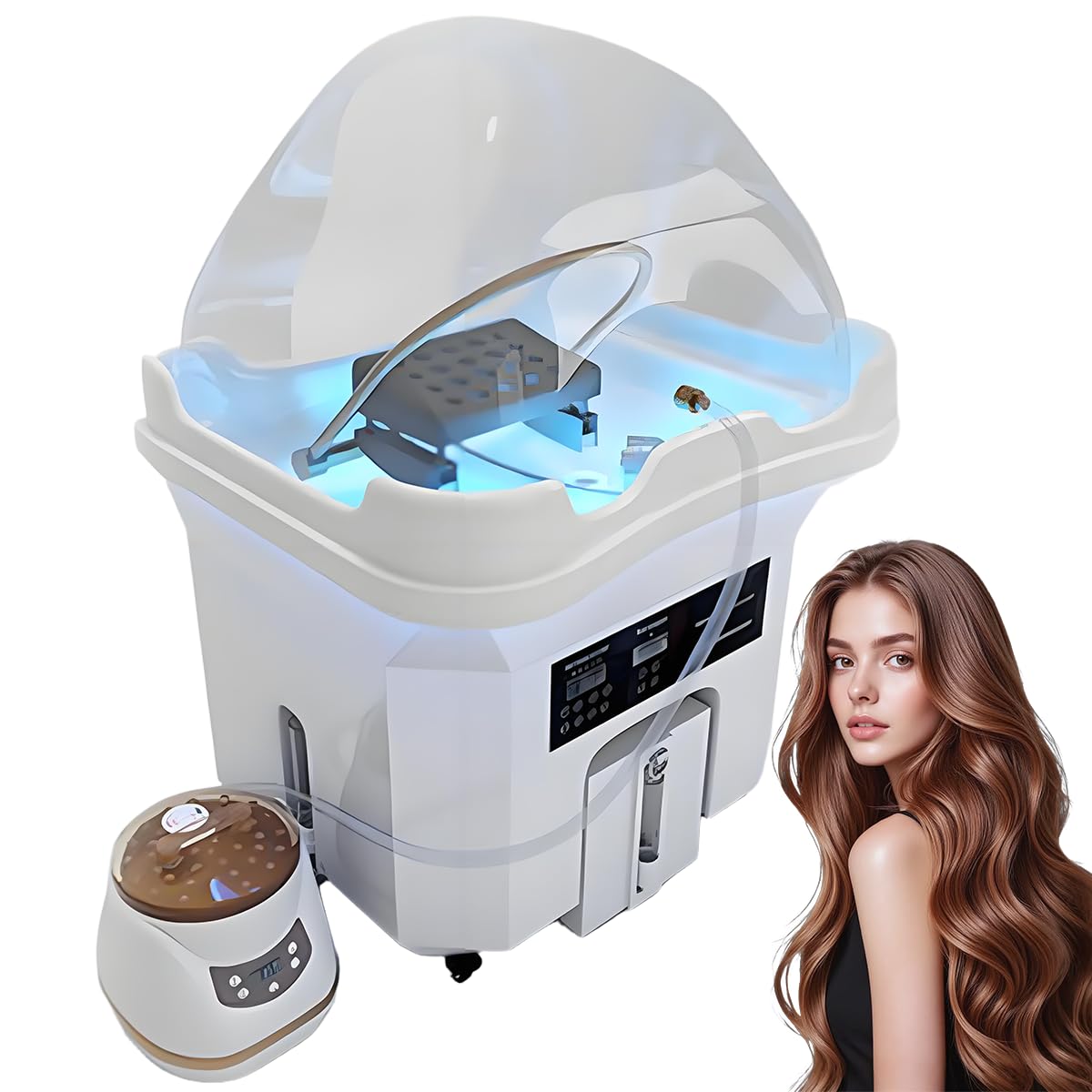 - 4️⃣ 【Fumigation Head Therapy】The head spa device is equipped with a steam three-piece set: a spa basin, steam machine, and fumigation hood. Add herbal solution or essence for fumigation to help relieve fatigue, improve sleep, and promote scalp circulation — enhancing relaxation and scalp health.
