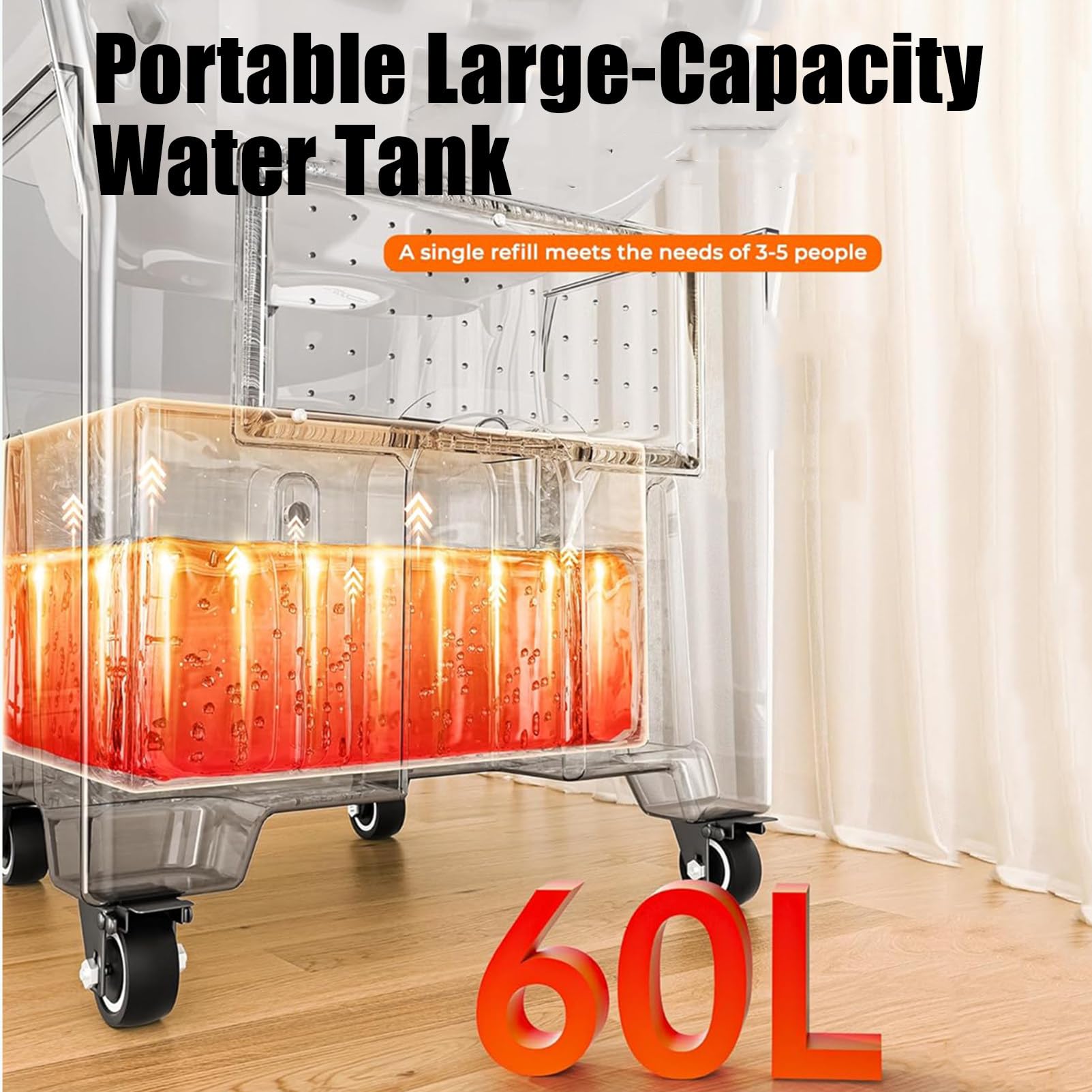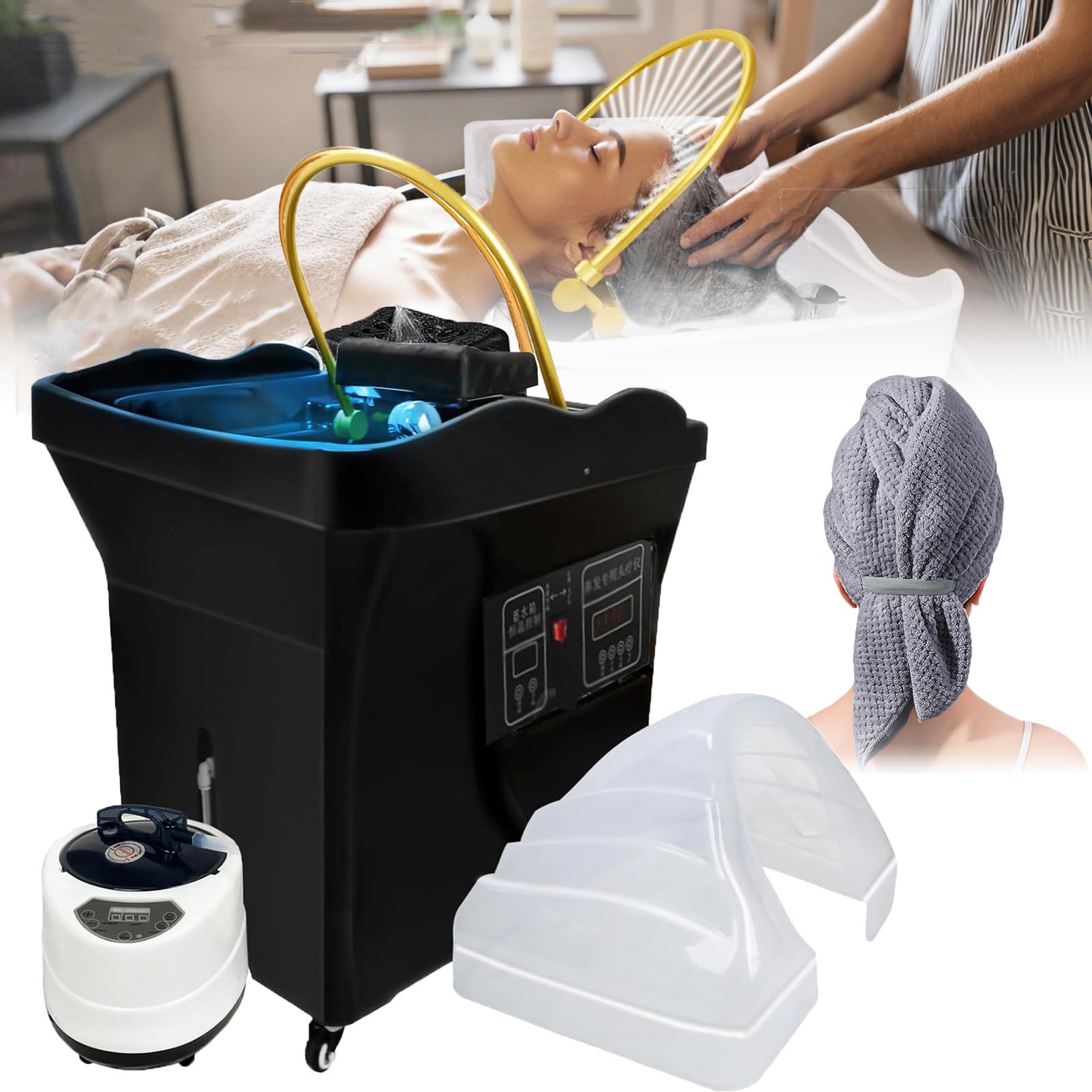- 【CONSTANT TEMPERATURE WATER CIRCULATION】● 40° constant temperature design, the built-in 60L water tank, circulator will heat the water to your set temperature (30°C to 55°C), keeping water at a constant temperature. 360° automatically circulating rinse, portable shampoo sink includes a frame with a waterfall outlet and a nozzle with a massage function, the essence is constantly absorbed and penetrates the hair core.