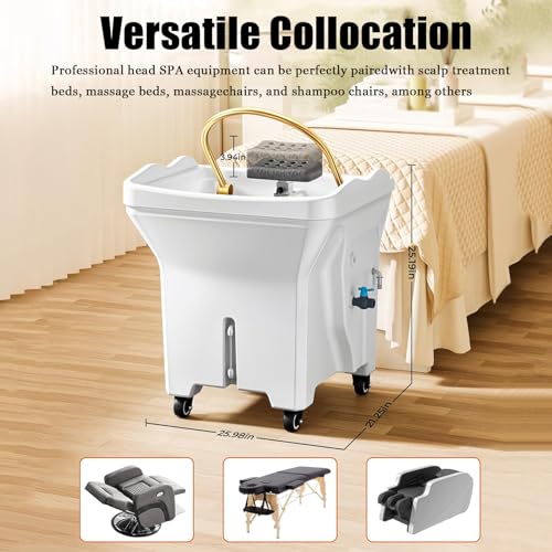 - 【APPLICABLE OCCASIONS】● Japanese head spa machine is a professional spa equipment that integrates shampooing, spa, steam therapy, light therapy, and hair care. It fits beauty salons, massage parlors, health spas, etc. It is also more compatible with most shampooing chairs, beauty chairs, head care beds, and massage beds. It has four fixable universal wheels at the bottom, which can be easily moved to the desired position.