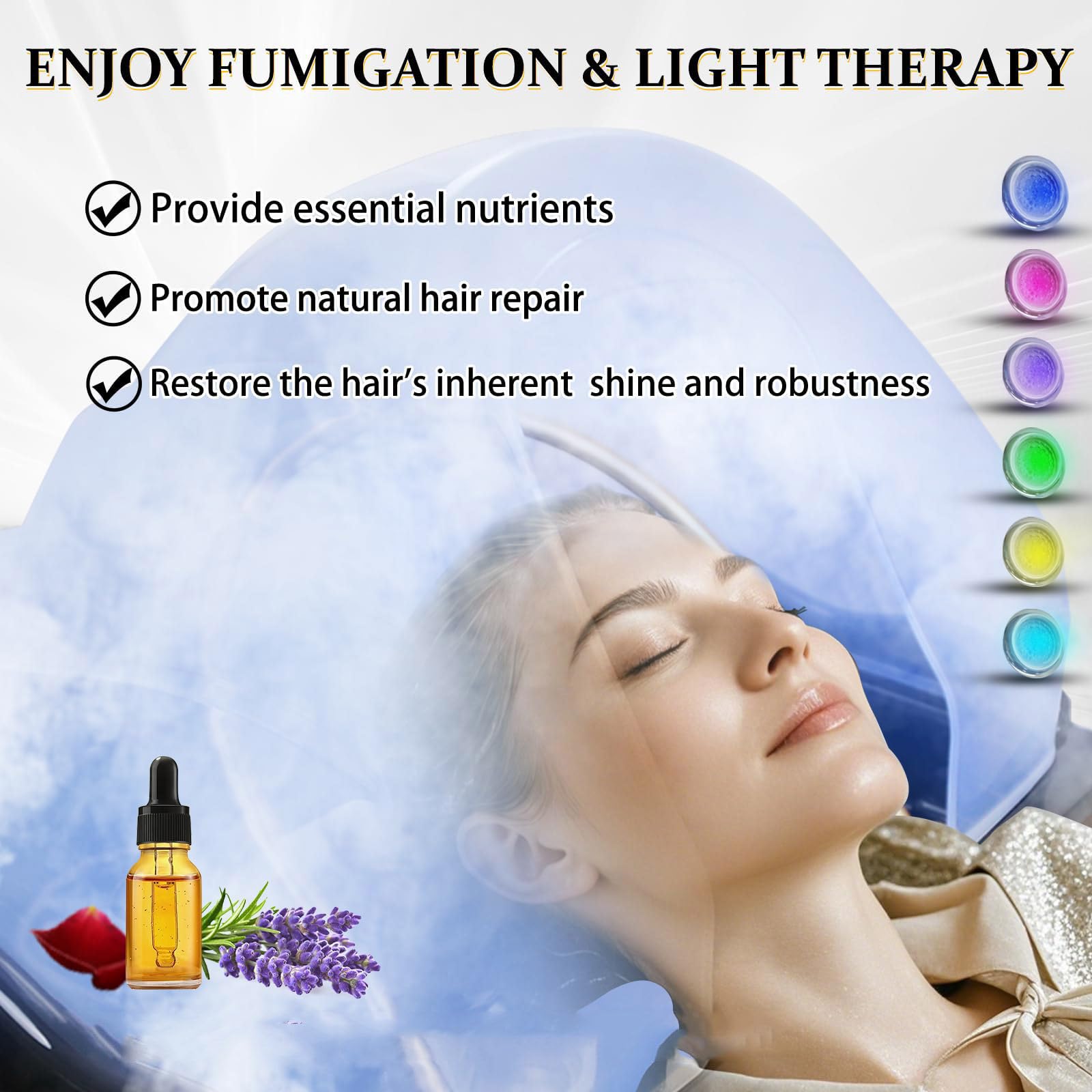 - Combinaison d’aromathérapie + luminothérapie LED : l’infusion de vapeur avec des huiles essentielles ouvre les cuticules des cheveux tandis que la thérapie par la lumière rouge/bleue (longueurs d’onde de 630 nm et 460 nm) répare les follicules au niveau cellulaire pour un rajeunissement holistique du cuir chevelu.