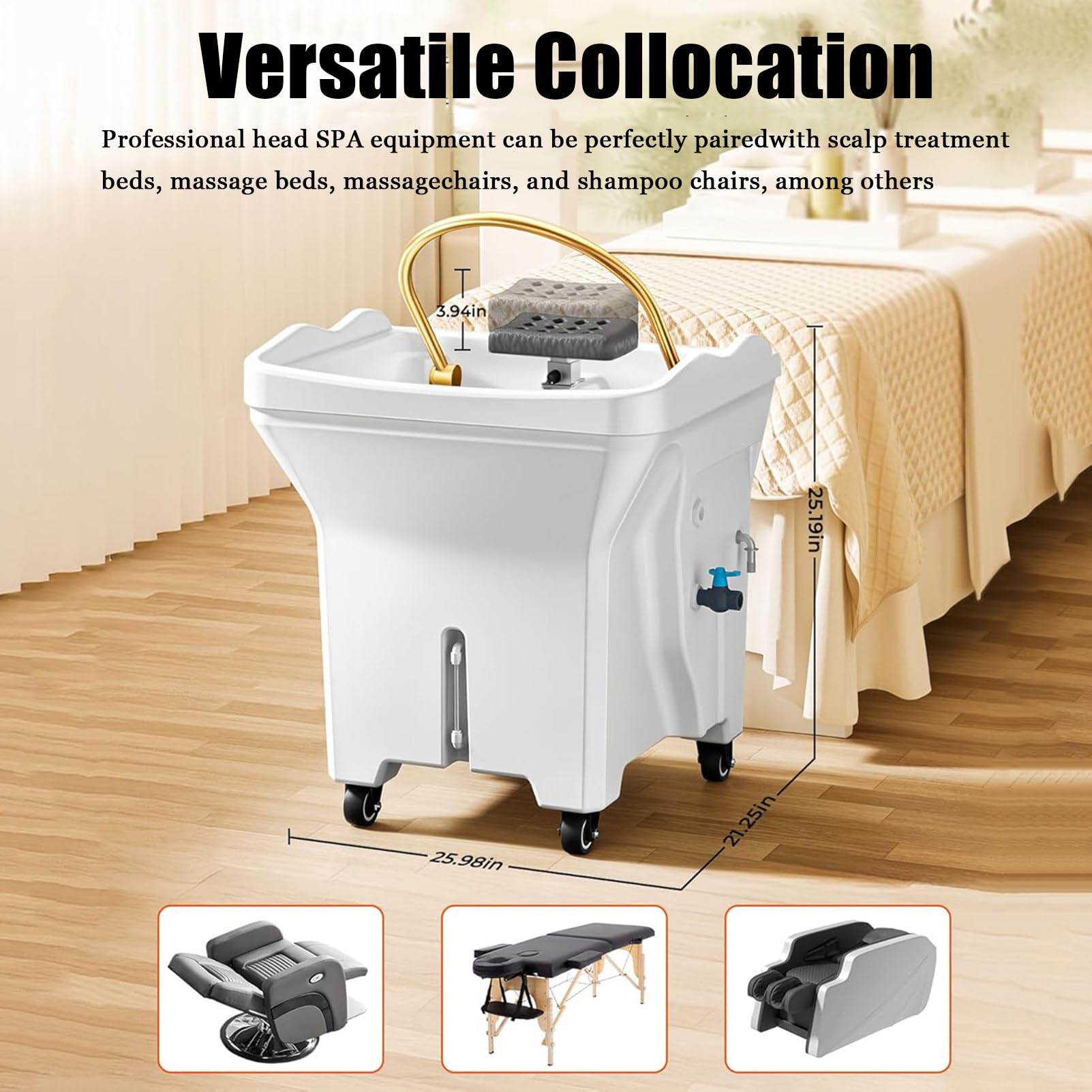 - 【OCCASIONS D’UTILISATION】● L’appareil de spa japonais est un équipement de spa professionnel intégrant shampoing, spa, hammam, luminothérapie et soins capillaires. Il convient aux salons de beauté, de massage, de bien-être, etc. Il est également compatible avec la plupart des fauteuils de shampoing, fauteuils d’esthétique, lits de soins et tables de massage. Il est équipé de quatre roulettes universelles fixes, qui permettent de le déplacer facilement dans la position souhaitée.
