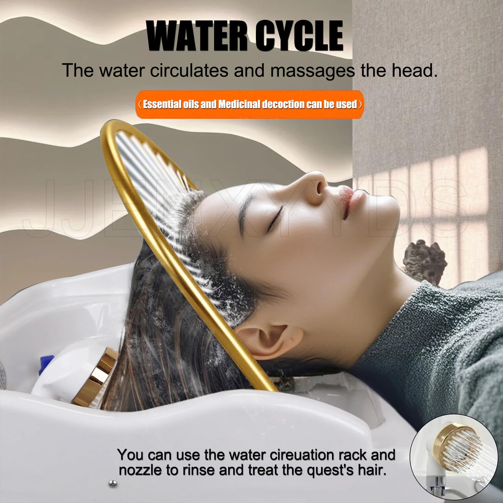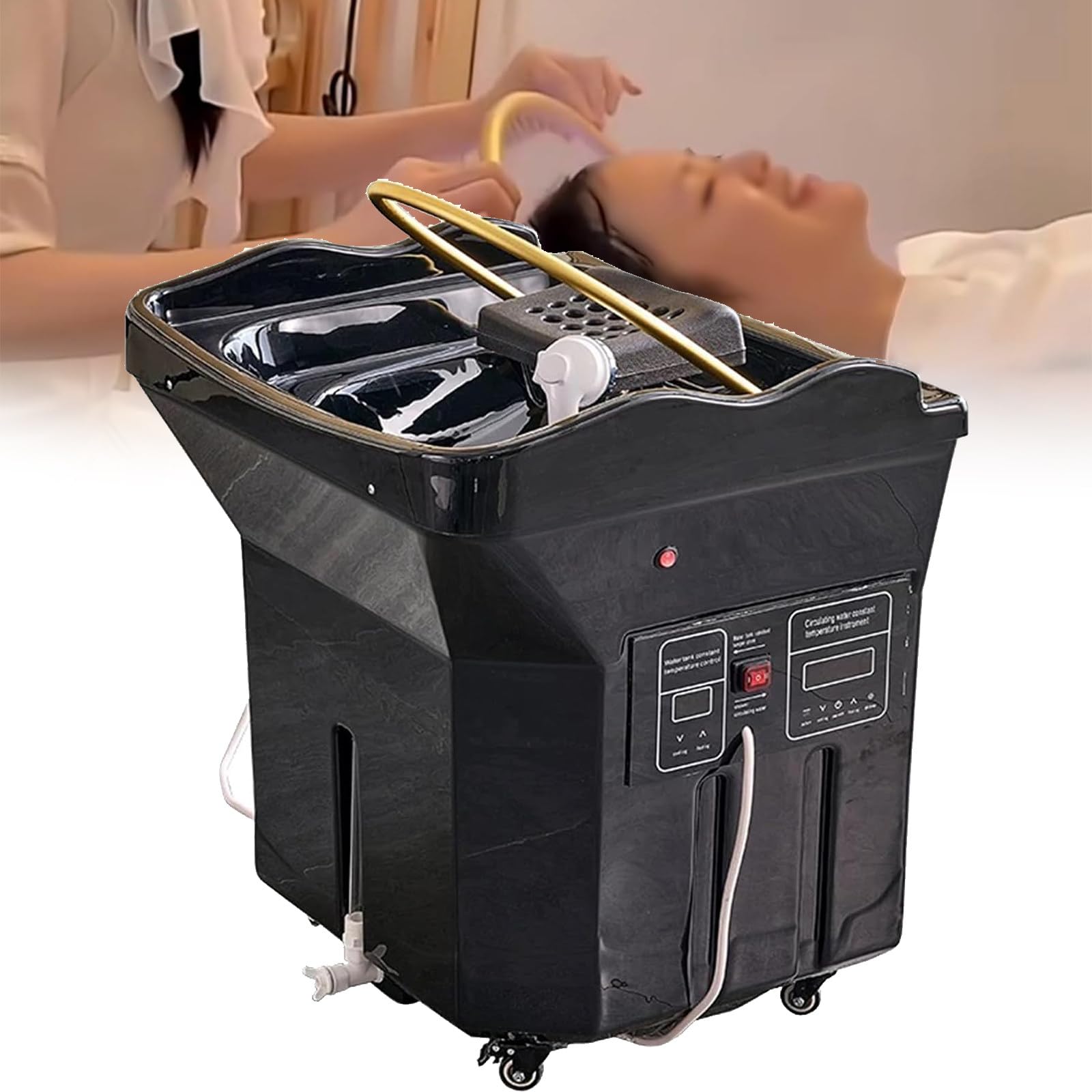 - 【Soin intelligent à circulation d’eau】Le système de circulation d’eau de ce bac à shampoing maintient un débit d’eau constant et guide précisément l’eau vers le cuir chevelu grâce à l’anneau doré en forme de U. Le doux jet d’eau masse le cuir chevelu et est compatible avec les huiles essentielles et les sérums professionnels. Détendez-vous profondément, soulagez les tensions cérébrales et restaurez la santé de votre cuir chevelu
