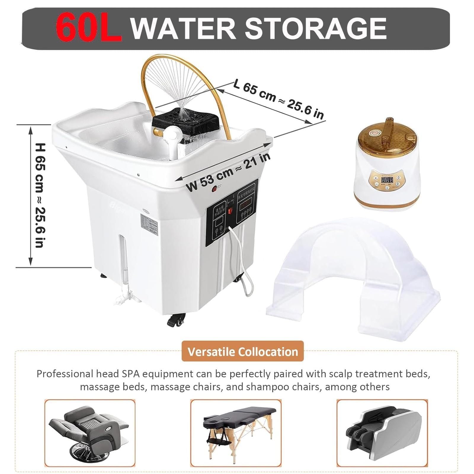 - 【MOBILITÉ AUTO-RANGEMENT À QUATRE ROUES (RÉSERVOIR INTÉGRÉ DE 60 L)】 Équipement de spa pour la tête. Pour les spathérapeutes et les propriétaires de salons mobiles. Aucune source d’eau externe n’est nécessaire : le réservoir intégré de 60 L permet 8 à 10 séances. Quatre roues verrouillables glissent facilement sur le sol et s’adaptent à la plupart des shampoings, lits de massage et tables de soins. Idéal pour les cliniques multi-salles ou les événements bien-être éphémères.