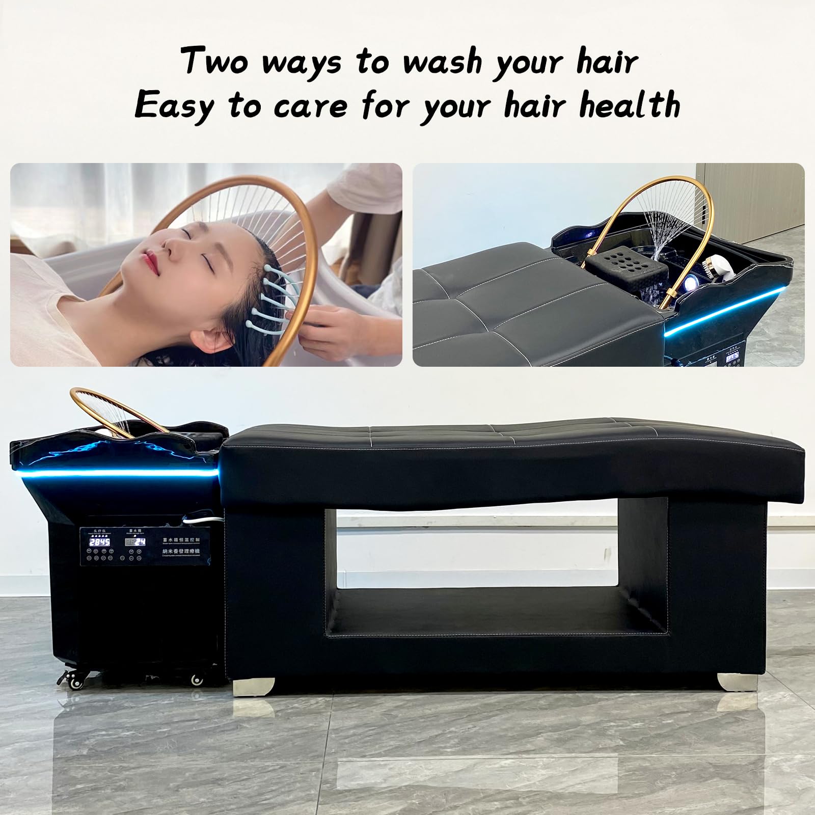 - 3 Circulation de l’eau à température constante: l’appareil de spa japonais a une conception de circulation de l’eau à température constante intégrée qui vous permet d’ajuster vous-même la température qui vous convient. Le rinçage circulaire à 360° détend le cuir chevelu et absorbe l’essence du massage.